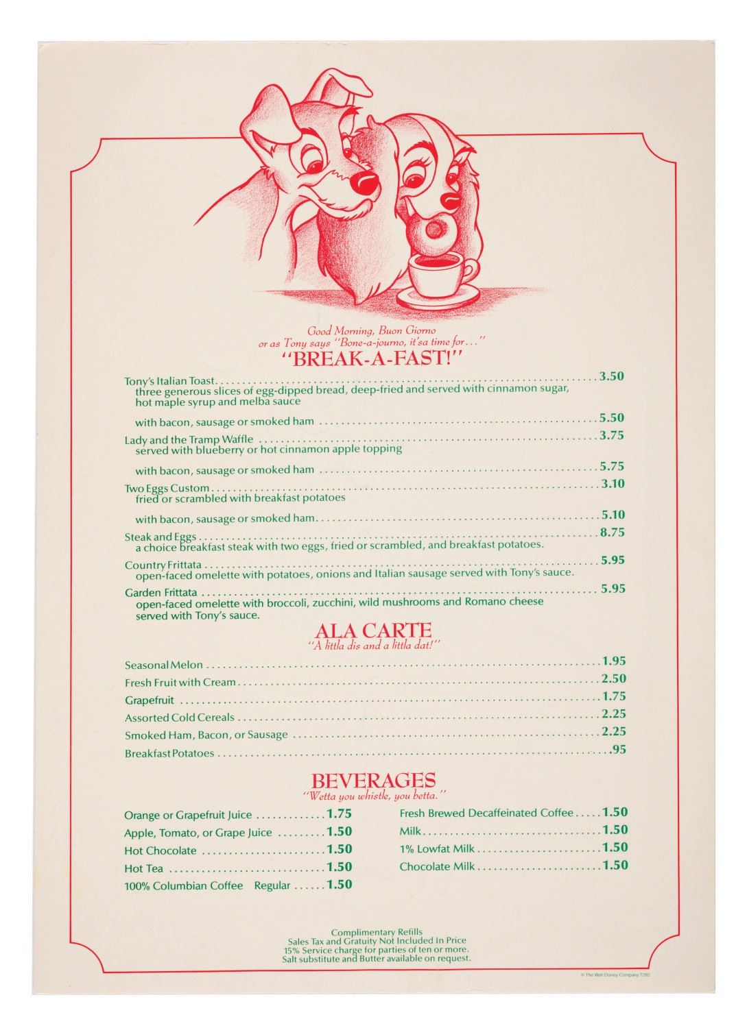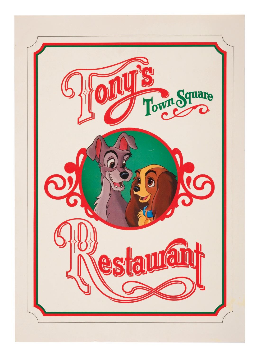 (Walt Disney World, 1982) A menu of Tony's Restaurant in Town Square at The Magic Kingdom. Measuring 9.5"x13.5", the menu is in very good condition, exhibiting a few small creases and slight wear to edges and corners from handling.
