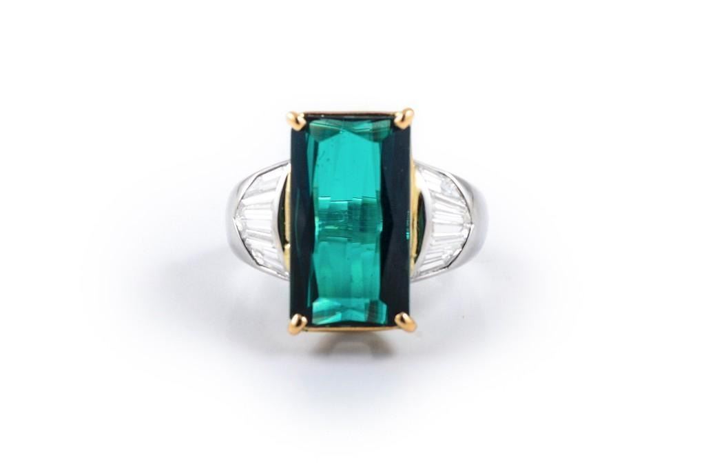 Set with a centered rectangular green tourmaline weighing approximately 7.34 carats, flanked by 8 fancy step-cut white diamonds weighing approximately 1.5 carats; mounted in Platinum and 18K yellow gold; size 5-3/4; weight 12.7g.