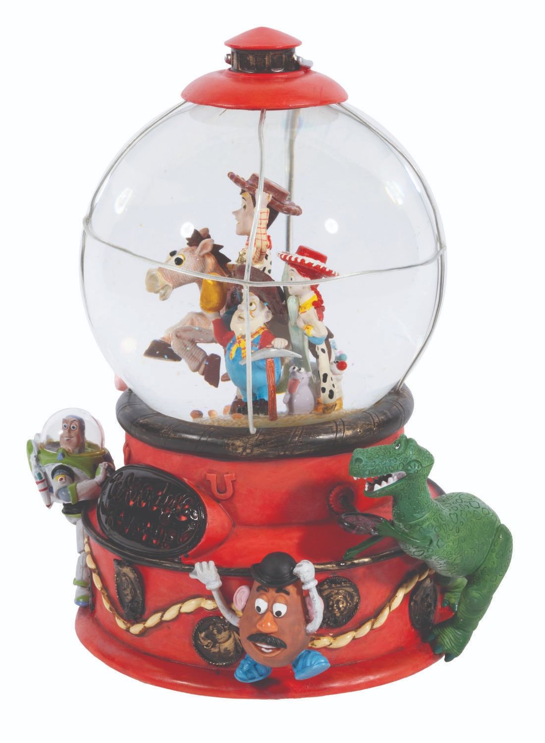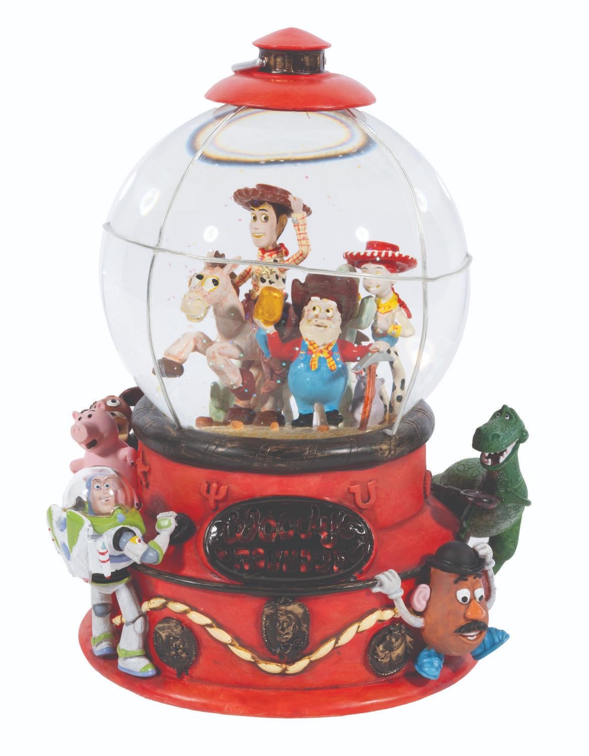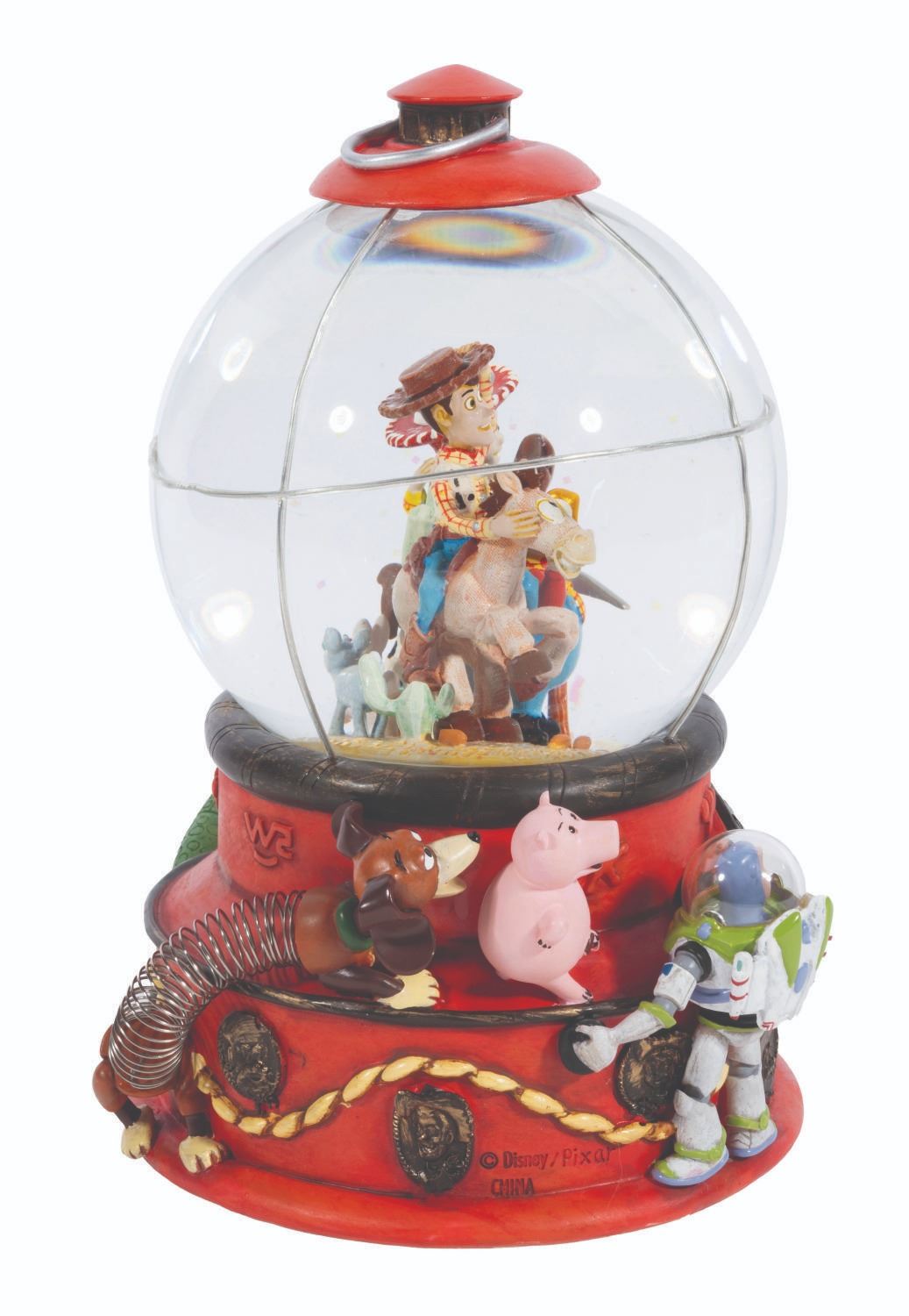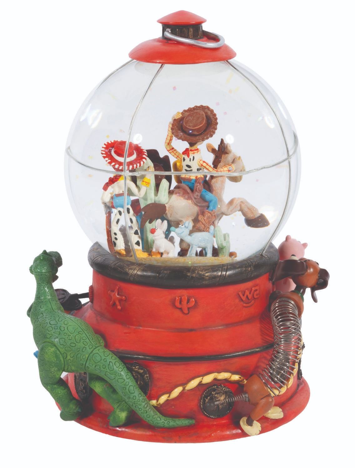 (Disney, 1999-2000s) A"Toy Story 2" musical snow globe. With two"AA" batteries (not included), the Woody’s Roundup plaque lights up. The musical feature plays the song"You’ve Got a Friend in Me." Measuring 6.5" in diameter x 8.5" high, the figural snow globe is in fine working condition.