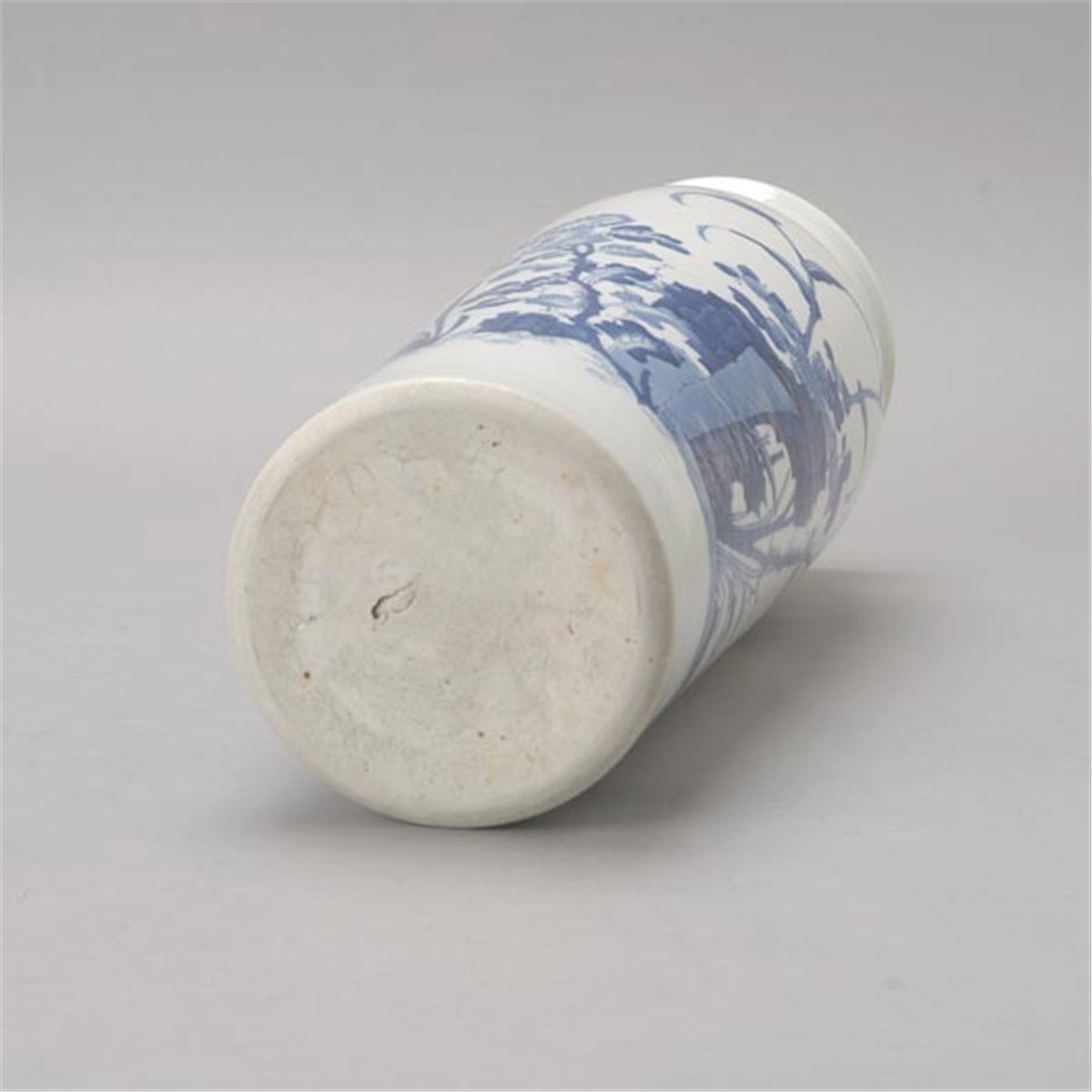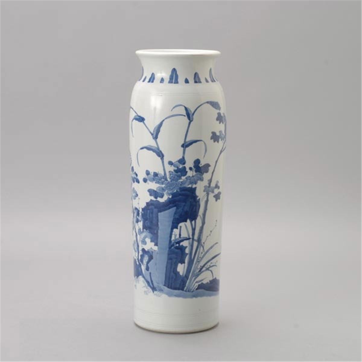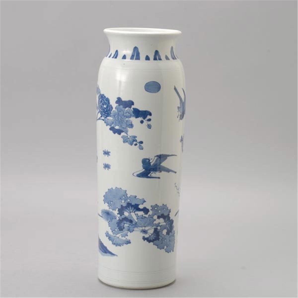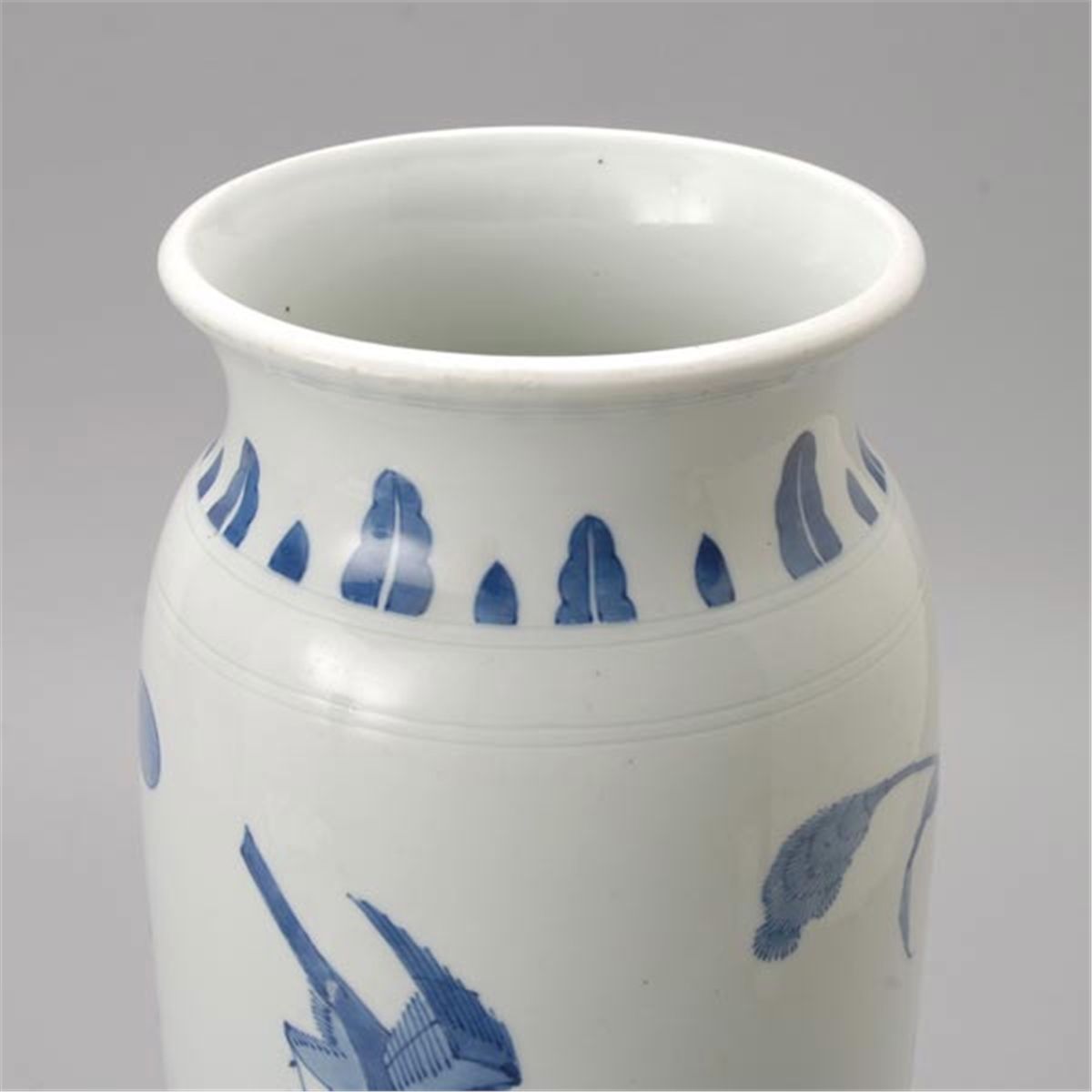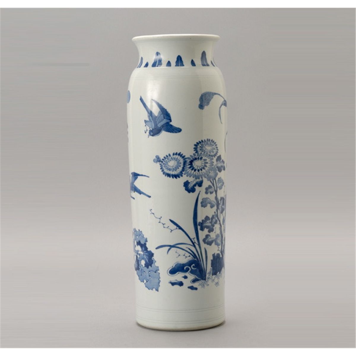 A Blue and White Porcelain Sleeve Vase, Well painted with birds and insects in flight among blossoming chrysanthemum, peonies, orchids and fox-tail grass issuing from a garden rock, all between incised anhua borders below a leaf tip band. Transitional Period, Height: 17 5/8 inches (44.8 cm)