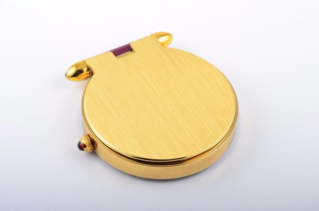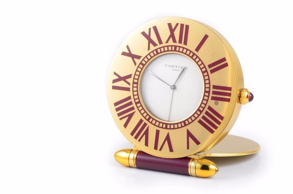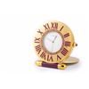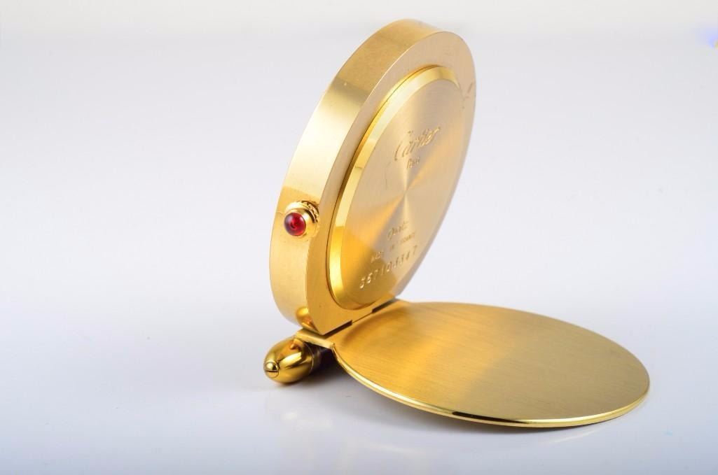 Cartier gold plated clock signed Cartier Paris, Made in France 357103347. Measures 2 1/4 inches x 2 inches, weight 145.3g.