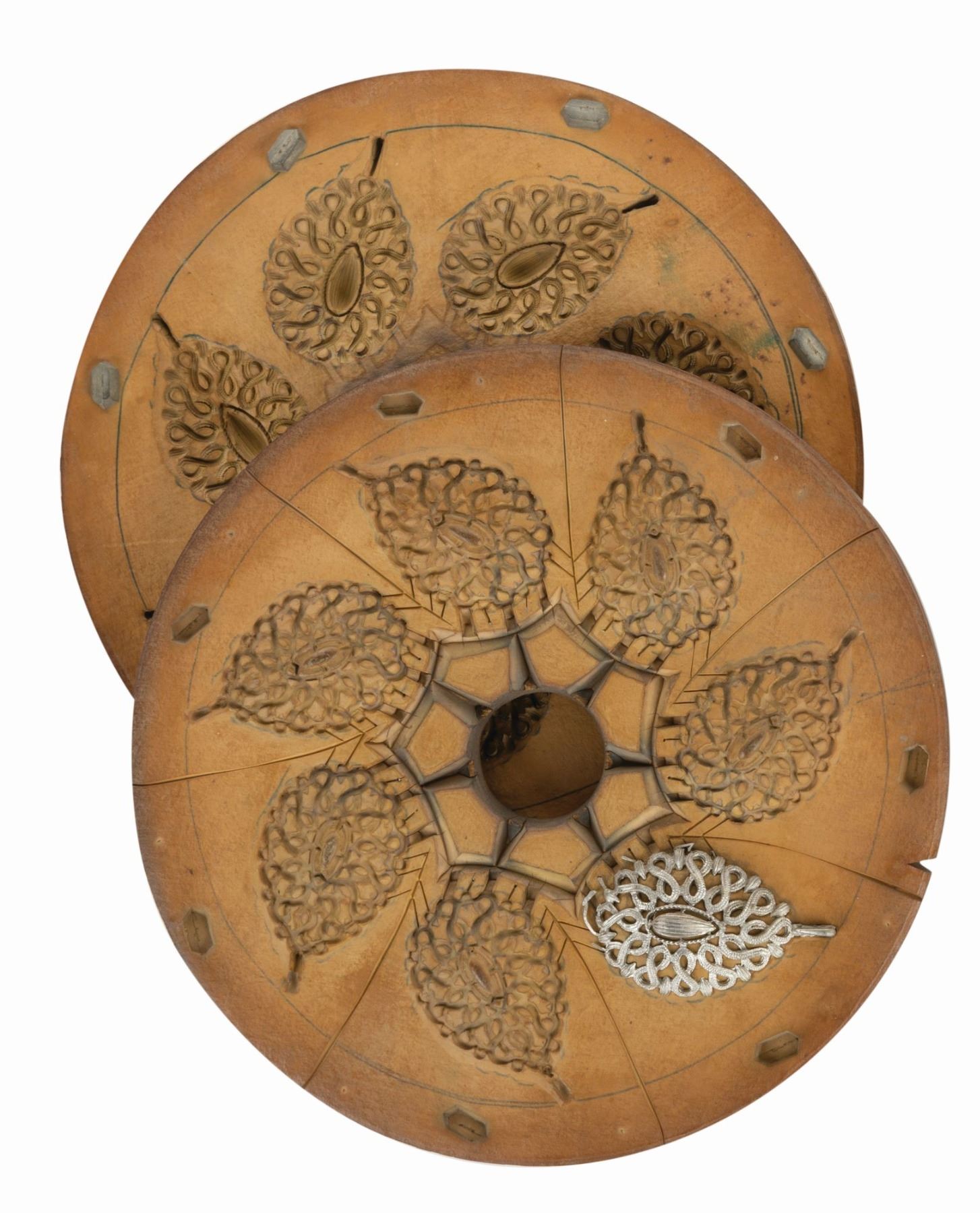 (Warner Bros., 1985) A rubber negative mold used to make jewelry for the legendary One-Eyed Willy's treasure in "The Goonies." The two-part mold threads together with plastic or metal studs. It is designed to create leaf-shaped brooches. There are inventory numbers handwritten on the side. Measuring 9" in diameter by 1.25" deep, the mold is in good production used condition with some exterior wear.