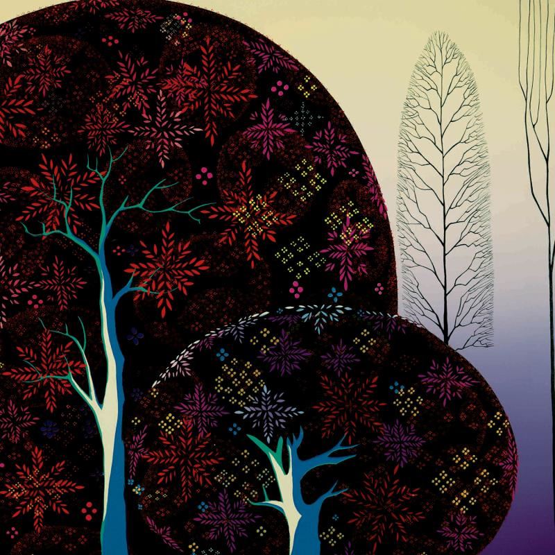 "A Tree Poem" is a limited edition serigraph on paper by Eyvind Earle (1916-2000). The piece is numbered, hand-signed by the artist, and accompanied by a certificate of authenticity. Measures approximately 20" x 40" (image).