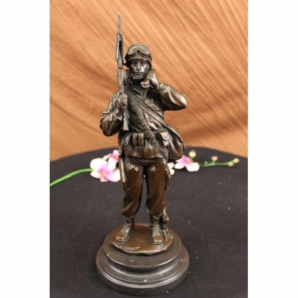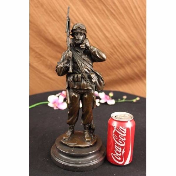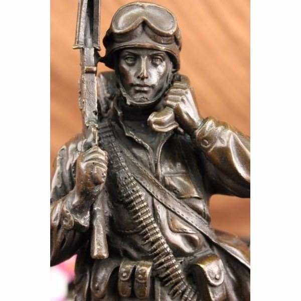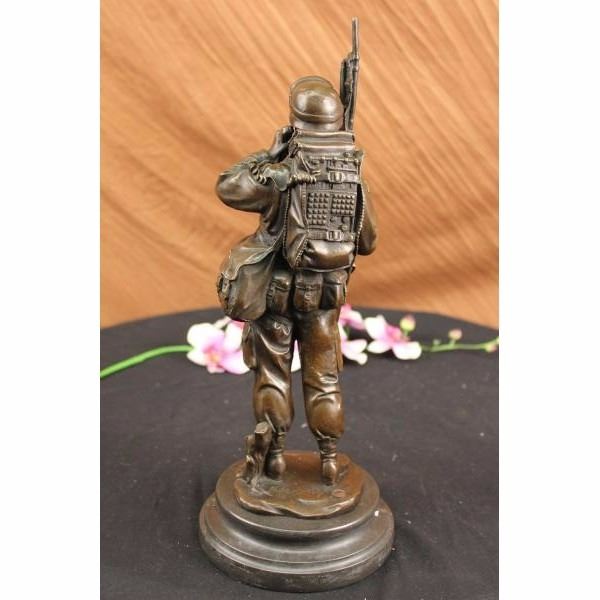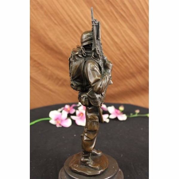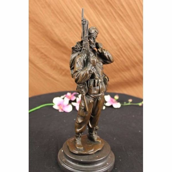This sculpture of a soldier is amazing. The details of the soldiers clothes are delightful and astonishing. To see how this artist took his time to add every single detail , like the pouch, the rifle and the ammo for it, the little cases where you can put away little objects. He wears a helmet with goggles over it, he makes orders through the portable phone he carries. This unique sculpture would be the perfect gift to anyone that was or is in the army. Fighting for our country is something to take pride over and its not an easy thing, a lot of peoples die fighting for us. 100% bronze and handmade, this brown patina sculpture was cast using the "Lost Wax Method" and is mounted on a round black marble base, signed by the artist Fisher. Condition: This sculpture is in a perfect condition. Bronze Dimensions with Marble Base:Height 15" x Width 6" Marble Dimensions: Diameter 6" Height without base: 14" Weight : 10 LBS Inventory : 49Y4763894