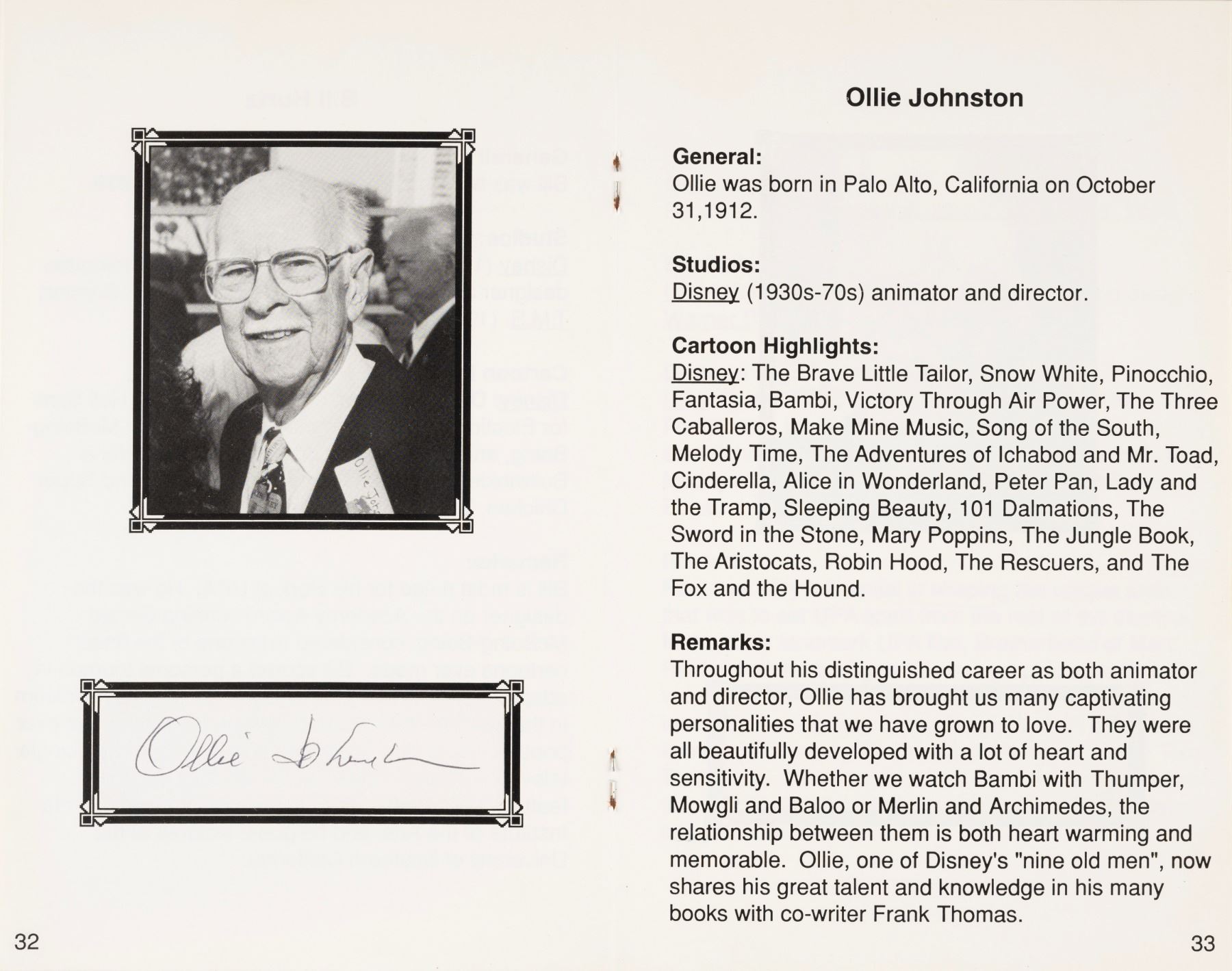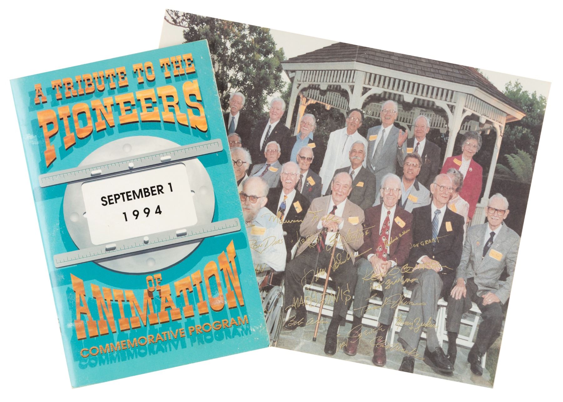 (Various, 1994) A signed “A Tribute to the Pioneers of Animation” commemorative program for an awards banquet held on September 1, 1994 paying tribute to some of the most notable innovators in the medium of animation. Featuring over 20 signatures including Ollie Johnson, Frank Thomas, Paul Julian, Richard Thomas, and Virgil Ross, the 8.5” x 5.5” program is in good condition with handling wear to the edges and corners and oxidization to the binding staples. Also included is a photo from the event with 21 reproduction signatures including Marc Davis, Joe Grant, Ed Benedict, and Bill Peet. The 8.5” x 10.5” photo is in good condition with a vertical fold running the length of the photo.