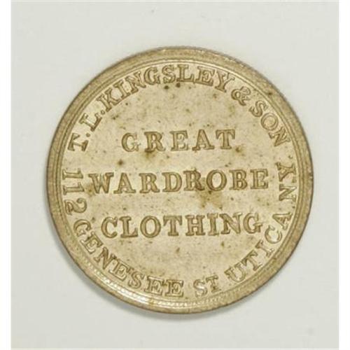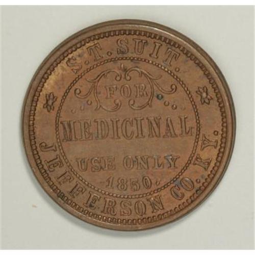 <B>A Trio of 1850s Store Cards.</B></I> These include: <B>S.T. Suit,</B></I> Jefferson County, KY, Miller-Ky 36, copper, AU with a few carbon flecks; <B>L.W. Lyons & Co.,</B></I> New Orleans, LA, Miller-La 38A, brass, plain edge, AU58 with hints of lilac toning; <B>T.L. Kingsley & Son,</B></I> Utica, NY, Miller-NY-1064, brass, reeded edge, AU58 with minor carbon.<BR><BR><b>Shipping:</b> Coins & Currency (<a target="_blank" href="http://www.heritageauctions.com/common/shipping.php">view shipping information</a>)
