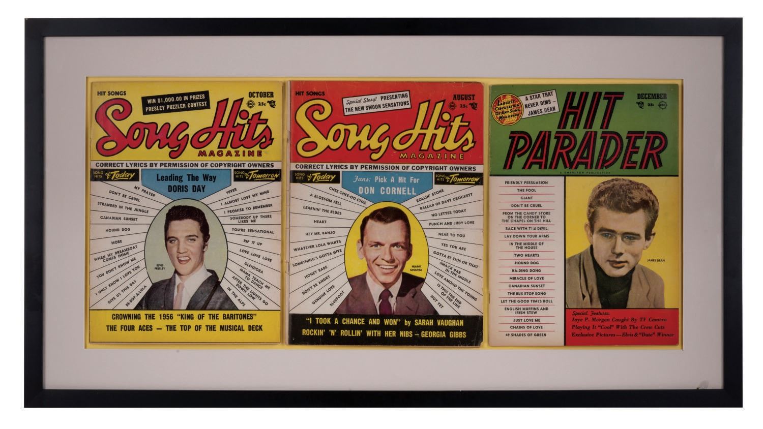 (Charlton, 1954-1956) A set of (3) music magazines of the 1950's, framed together. Covers feature top stars Elvis Presley, Frank Sinatra, and James Dean. The total framed piece measures 17.25"x 31.75". Measuring 11.25"x8" each, the magazines display in very good condition, with edge wear typical of use.