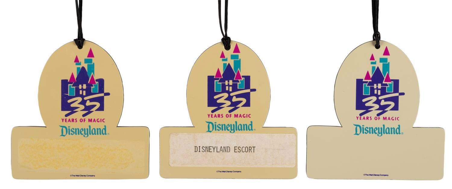 (Disneyland, 1990) Three Press and Cast Escort badges for Disneyland's 35th anniversary celebration. Measuring 3.75" x 3.75" each, the badges are in very good to fine condition with discoloration, surface scratching, adhesive residue, and a label.