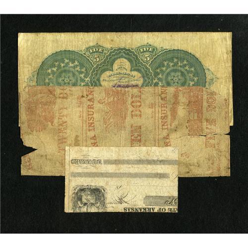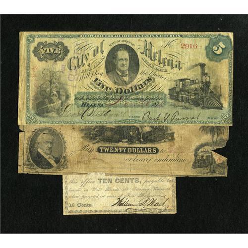 <B>A Trio of Arkansas Obsoletes,</B></I> including:<BR><B>Helena, AR- City of Helena</B></I> $5 Oct. 20, 1871 Rothert 280-3, Fine+<BR><B>Helena, AR- Exchange Bank</B></I> $20 18__ Rothert 279-3, About Good<BR><B>Little Rock, AR- William B. Wait</B></I> 10 March 25, 1862 Rothert 441-1, Very Fine.<BR><BR><b>Shipping:</b> Coins & Currency (<a target="_blank" href="http://www.heritageauctions.com/common/shipping.php">view shipping information</a>)