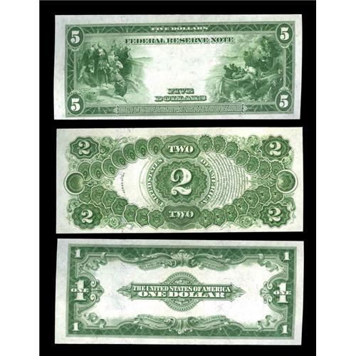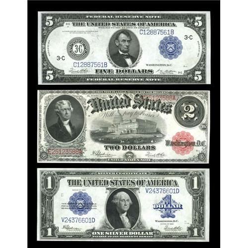 <B>A Trio of Better Condition Large Size Notes</B></I><BR>Fr. 60 $2 1917 Legal Tender Choice New<BR>Fr. 237 $1 1923 Silver Certificate Gem New<BR>Fr. 855c $5 1914 Federal Reserve Note Choice New.<BR>A bright and attractive group lot.<BR>