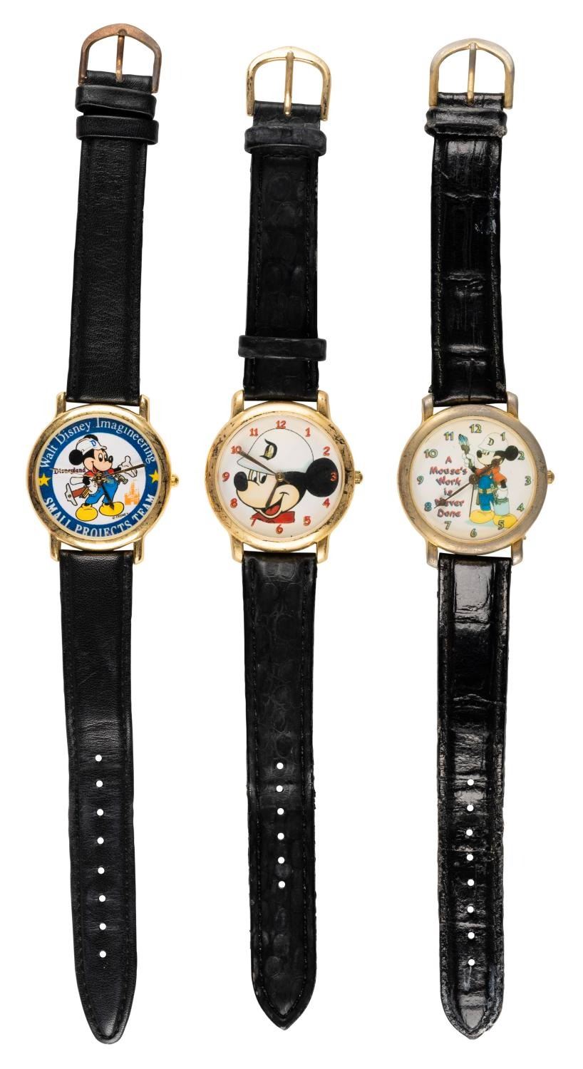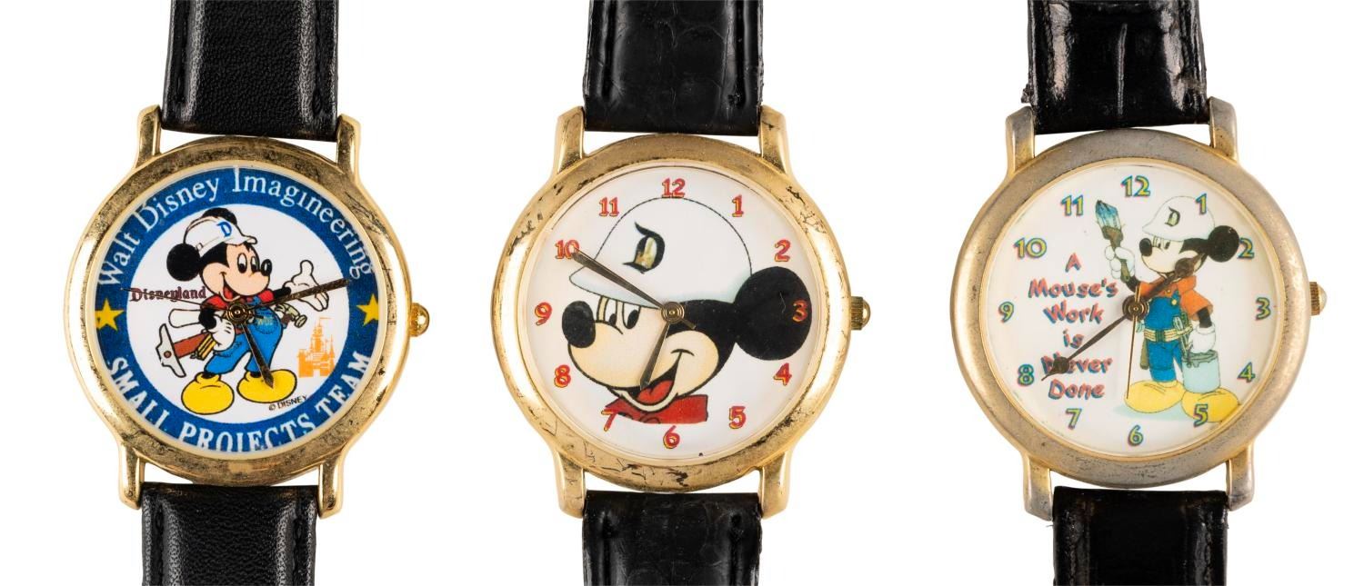 (Disneyland, 1980s-90s) A collection of three Disneyland Cast Member watches featuring Mickey Mouse. Included are a Walt Disney Imagineering Small Projects Team watch, an A Mouse’s Work is Never Done watch, and a Mickey in a hard hat watch. The watches did not work when tested, requiring repair to function properly. Ranging in size from 9.5” to 9.75” long, the watches display in good condition with scuffs, scratches, and wear.