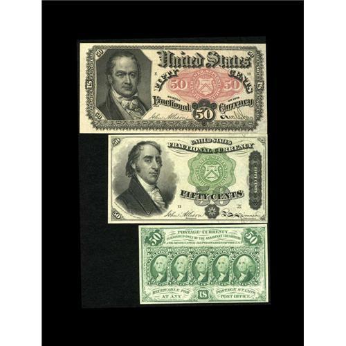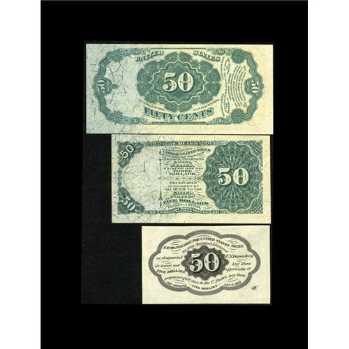 <B>A Trio of Fifty Cent Notes.</B></I><BR>Fr. 1312 50¢ First Issue <B>Very Choice New</B></I><BR>Fr. 1379 50¢ Fourth Issue <B>Gem New</B></I><BR>Fr. 1381 50¢ Fifth Issue <B>Superb Gem New</B></I><BR>A nice Fifty Cent starter set.<BR>