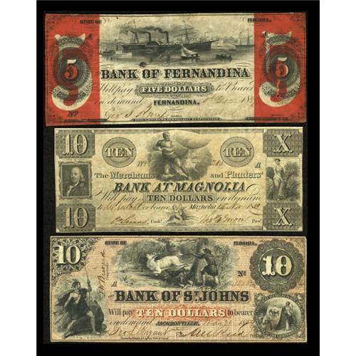 <B>A Trio of Florida Obsoletes:</B></I><BR> <B>Fernandina, FL- Bank of Fernandina </B></I>$5 Dec. 1, 1859 G2a, Freeman 4, <B>Fine, </B></I>with an internal split;<BR><B>Jacksonville, FL- Bank of St. Johns </B></I>$10 May 21, 1859 G4a, Freeman 17, <B>Fine+;</B></I><BR>and a <B>Magnolia, FL- Bank At Magnolia </B></I>$10 Nov. 14, 1833 G8, Freeman 4, <B>Very Fine.</B></I><BR><BR><b>Shipping:</b> Coins & Currency (<a target="_blank" href="http://www.heritageauctions.com/common/shipping.php">view shipping information</a>)