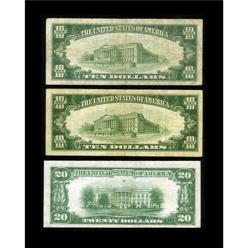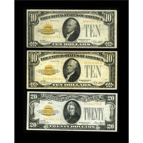 <B>A Trio of Gold Certificates</B></I><BR>Fr. 2400 $10 1928 Gold Certificates (2) <B>F, VF</B></I><BR>Fr. 2402 $20 1928 Gold Certificate <B>Extremely Fine</B></I>.<BR> <BR><BR><B>Important notice