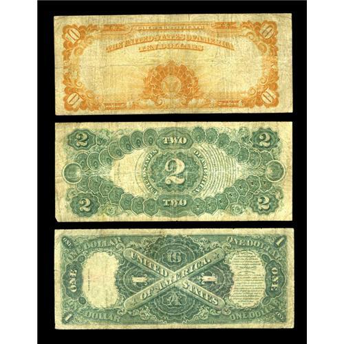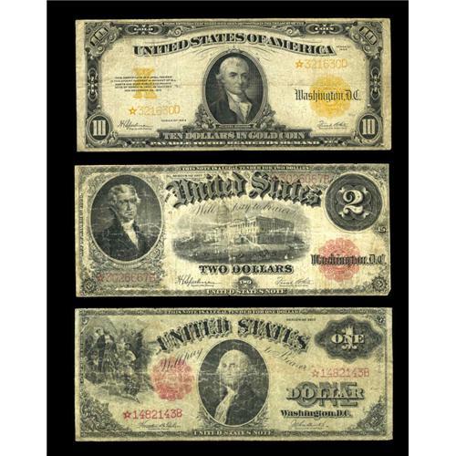 <B>A Trio of Large Size Star Notes</B></I><BR>Fr. 36* $1 1917 Legal Tender G-VG<BR>Fr. 60* $2 1917 Legal Tender VG<BR>Fr. 1173* $10 1922 Mule Gold Star Certificate Fine Scarce.<BR>