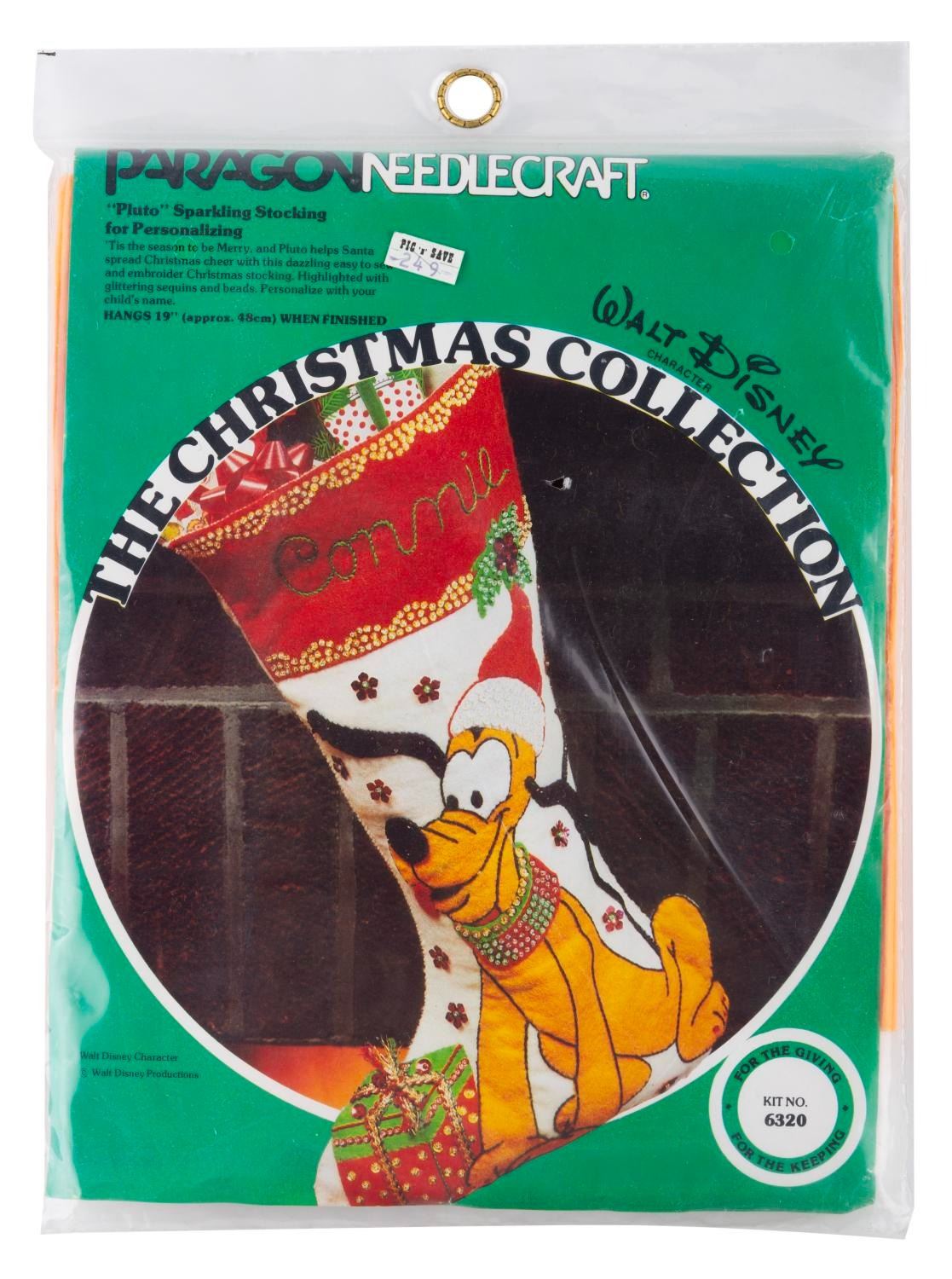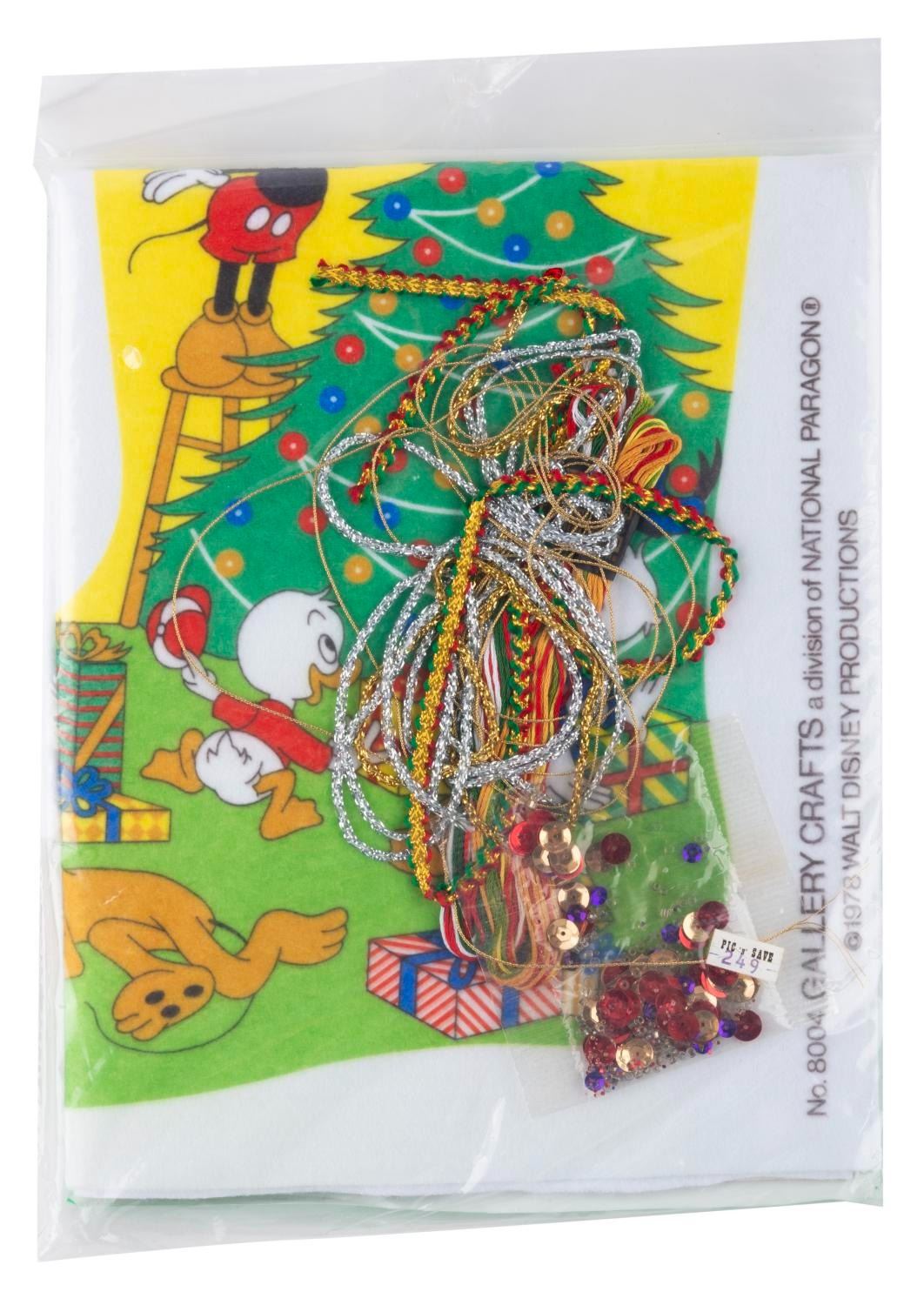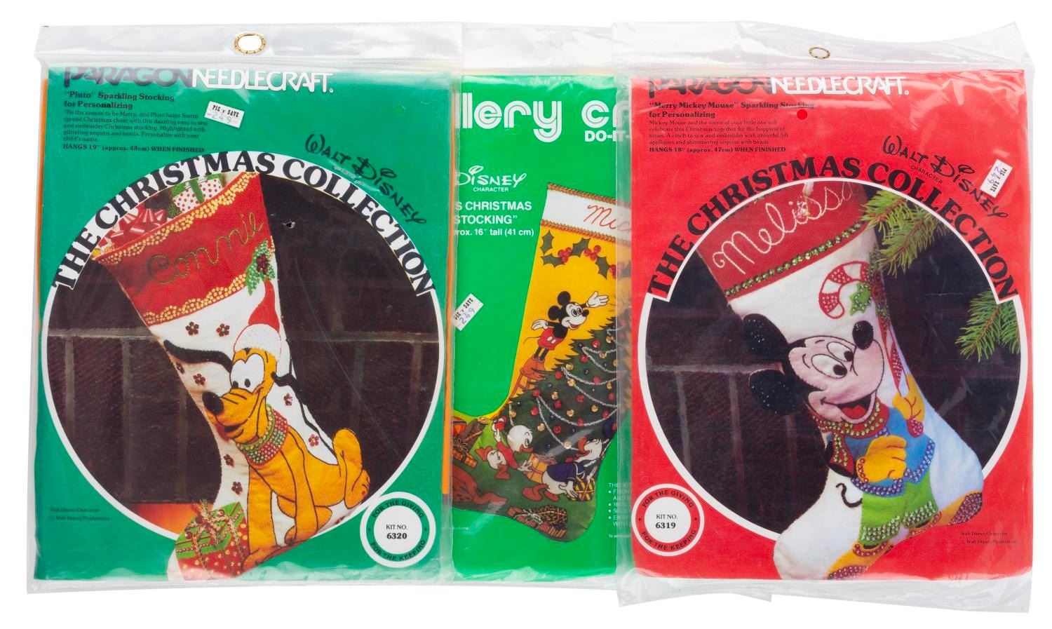 (Paragon, 1970s-80s) Three embroidery kits with materials and patterns to craft personalized Christmas stockings of Pluto, Mickey, and a decorating scene. The kits are in fine, unopened condition, with possible light wear from age.