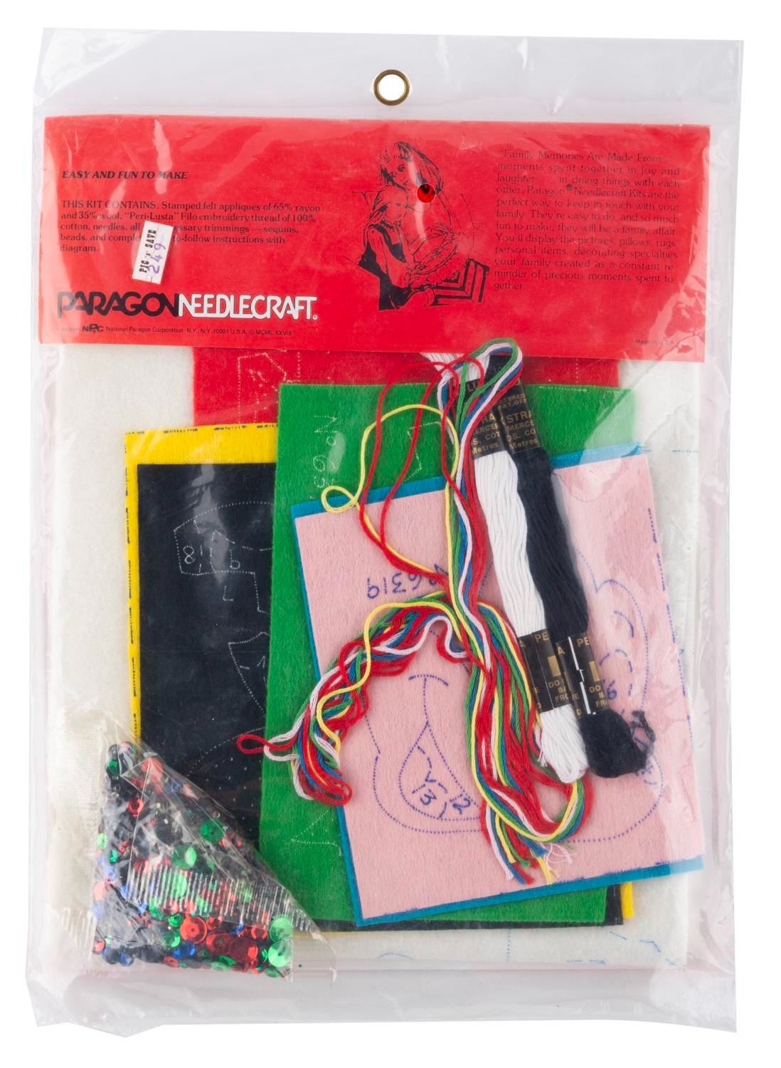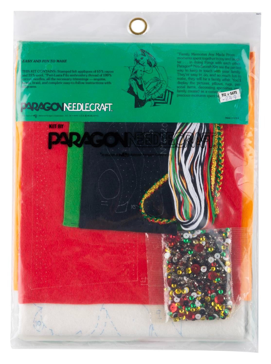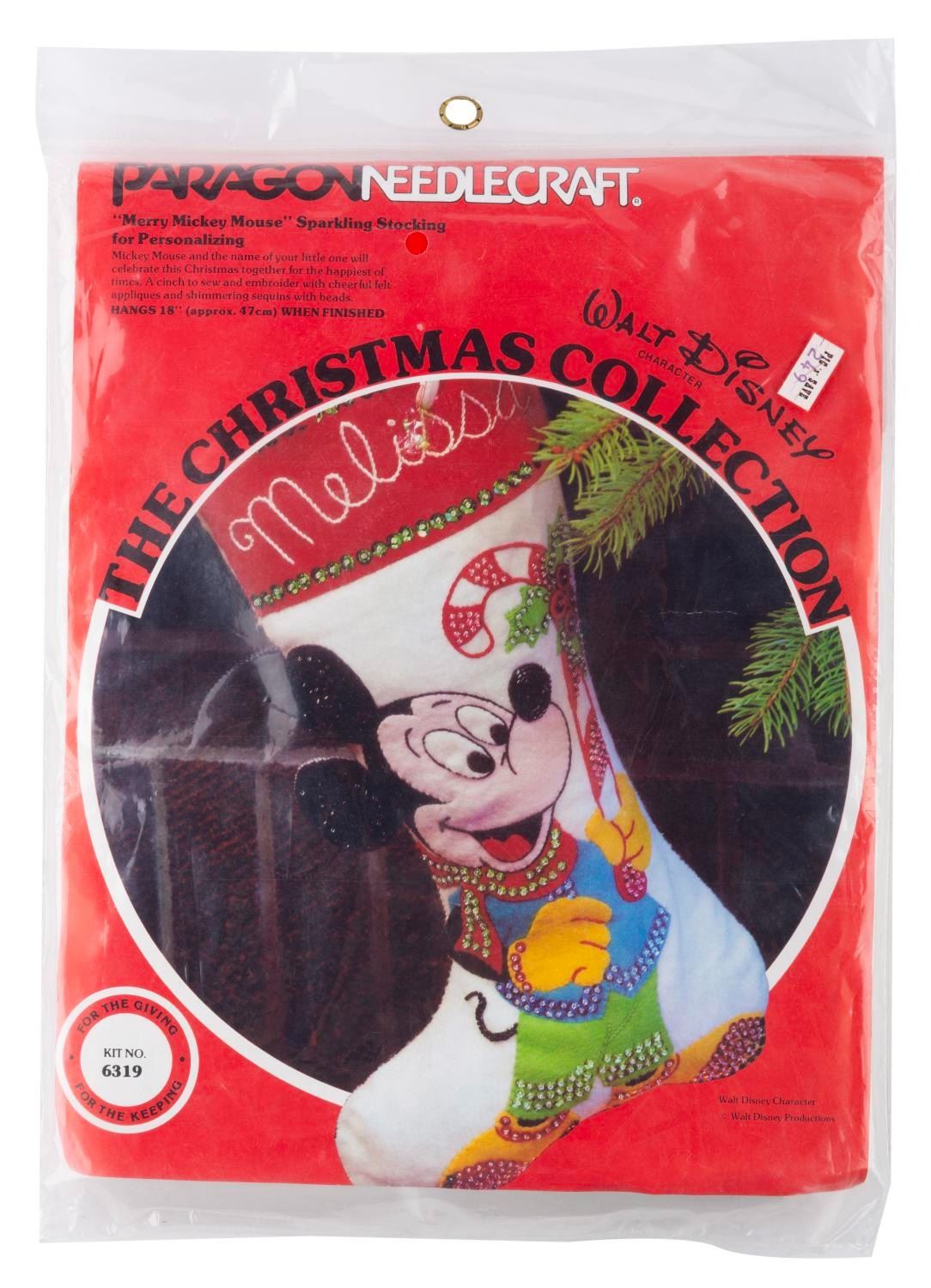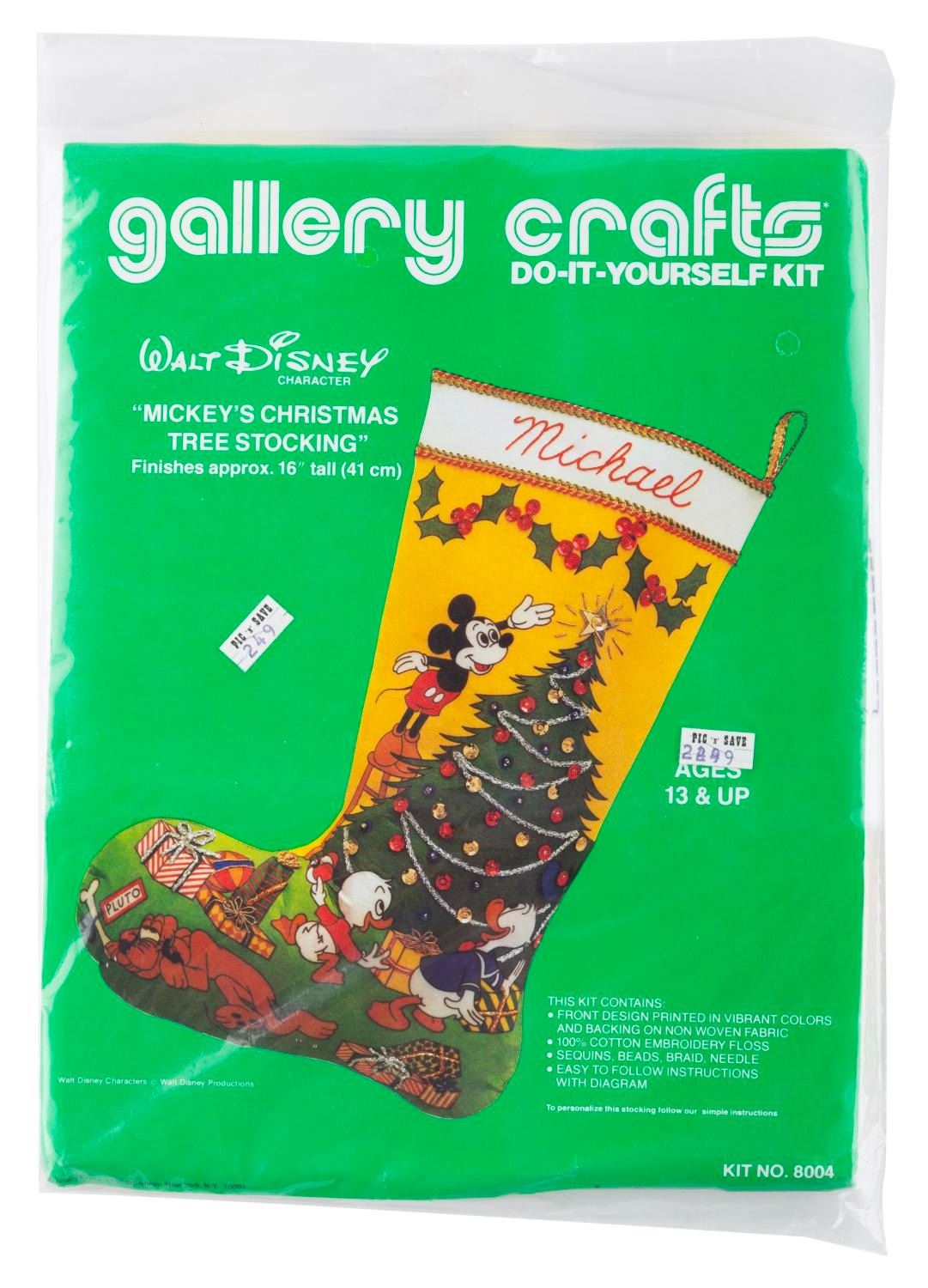 (Paragon, 1970s-80s) Three embroidery kits with materials and patterns to craft personalized Christmas stockings of Pluto, Mickey, and a decorating scene. The kits are in fine, unopened condition, with possible light wear from age.