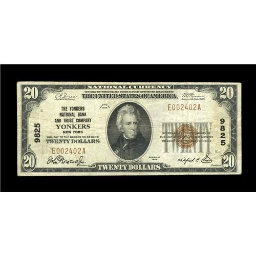 <B>A Trio of Notes from Westchester County</B></I><BR>Fr. 1802-1 $20 1929 Ty. 1 Yonkers NB & TC Ch. # 9825 VF (2)<BR>Fr. 1802-1 $20 1929 Ty. 1 Central NB Ch. # 13319 F-VF.<BR> A group lot representing substantial value from a strongly collected County in the Empire State.<BR>