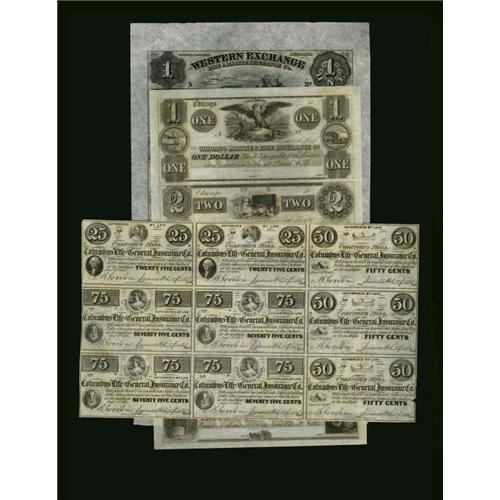 <B>A Trio of Obsolete Sheets, Including</B></I><BR><B>Chicago, IL- Chicago Marine & Fire Insurance Co.</B></I> $1-$2-$3-$5 <B>EF-AU</B></I><BR><B>Columbus, MS- Columbus Life & General Insurance Co.</B></I> 25¢-25¢-50¢-75¢-75¢-50¢-75¢-75¢-50¢ Jan. 1, 1864 <B>EF-AU</B></I><BR><B>Omaha City, NE- Western Exchange Fire & Marine Insurance Co.</B></I> $1-$2-$3-$5 Nov. 2, 1857 <B>AU-CU</B></I>