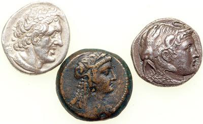 A Trio of Ptolemaic Coinage. Consists of: Ptolemy I AR tetradrachm (16.5 g) Attic standard; Ptolemy I AR tetradrachm with tiny delta behind ear; Cleopatra I AE 27 mm. Coins grade Fine to Very Fine. Well worth our conservative estimate. Lot of 3 coins.
