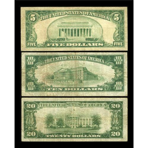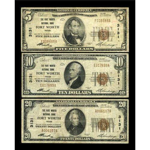 <B>A Trio of Small Size Fort Worth Notes, including:</B></I><BR> Fort Worth NB - $5 1929 Ty. 1 <B>The Fort Worth NB</B></I> Ch. # 3131, <B>Fine;</B></I><BR>Fort Worth NB - $10 1929 Ty. 1 <B>The Fort Worth NB</B></I> Ch. # 3131, <B>Very Fine;</B></I><BR>and a Fort Worth NB - $20 1929 Ty. 1 <B>The Fort Worth NB</B></I> Ch. # 3131, <B>Very Fine.</B></I><BR><BR><b>Shipping:</b> Coins & Currency (<a target="_blank" href="http://www.heritageauctions.com/common/shipping.php">view shipping information</a>)