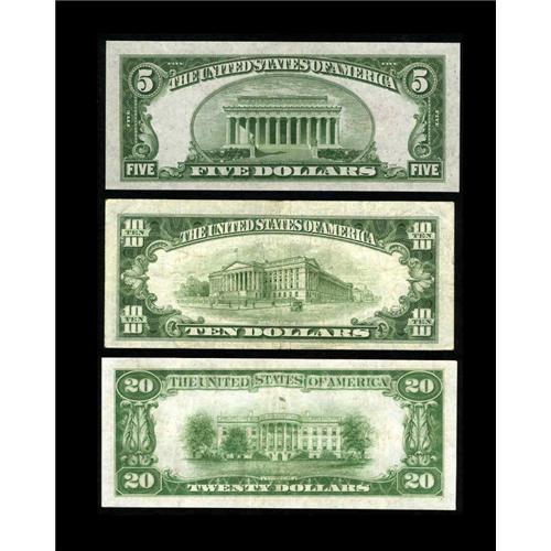 <B>A Trio of Small Size Star Notes</B></I><BR>Fr. 1528* $5 1928C Legal Tender Note <B>Gem CU</B></I><BR>Fr. 2010-E* $10 1950 Federal Reserve Note <B>VF</B></I><BR>Fr. 2052-G* $20 1928B Federal Reserve Note <B>VF</B></I>.<BR>A better star group with plenty of value, as the $10 is of the Narrow variety.<BR>