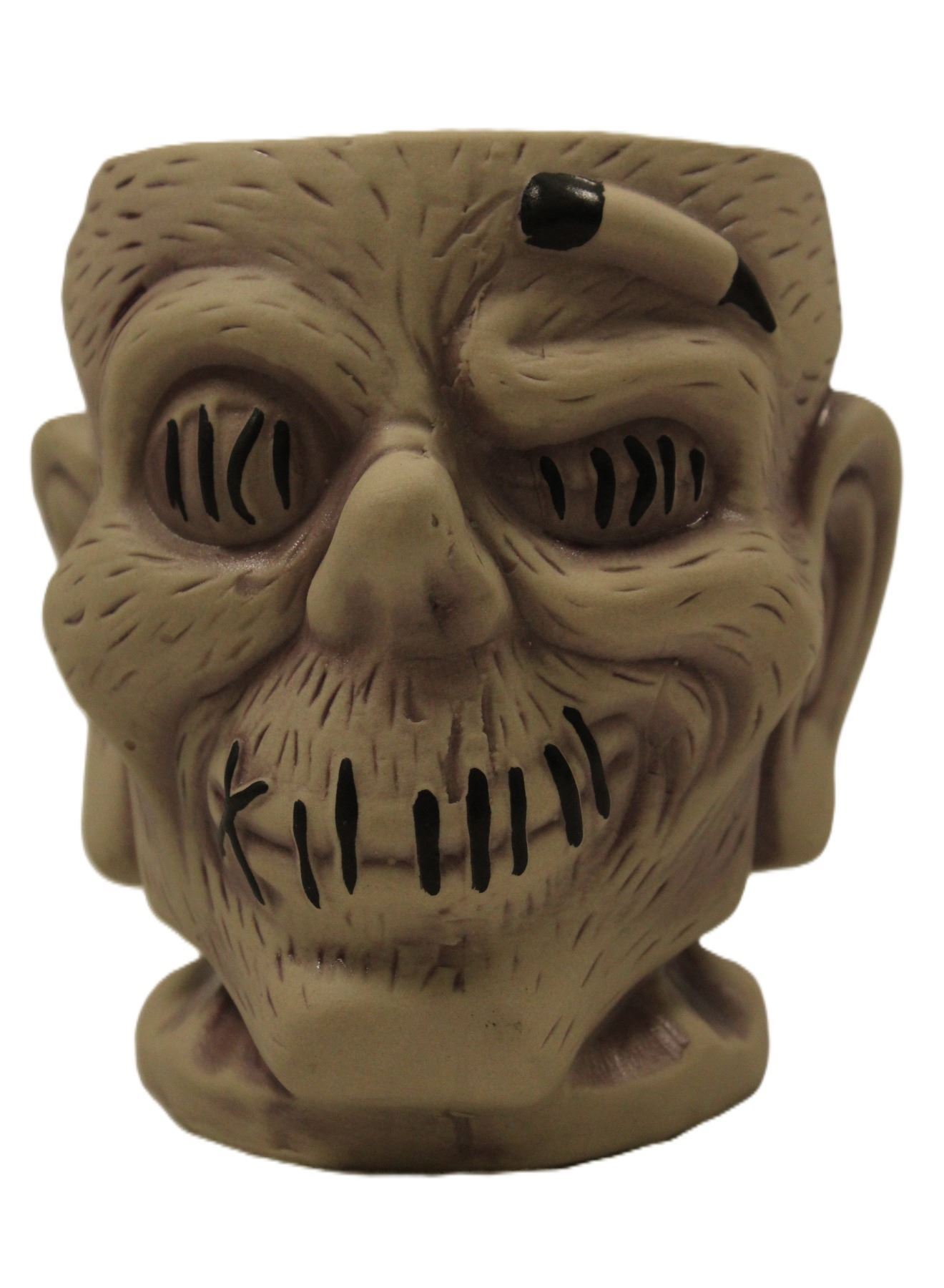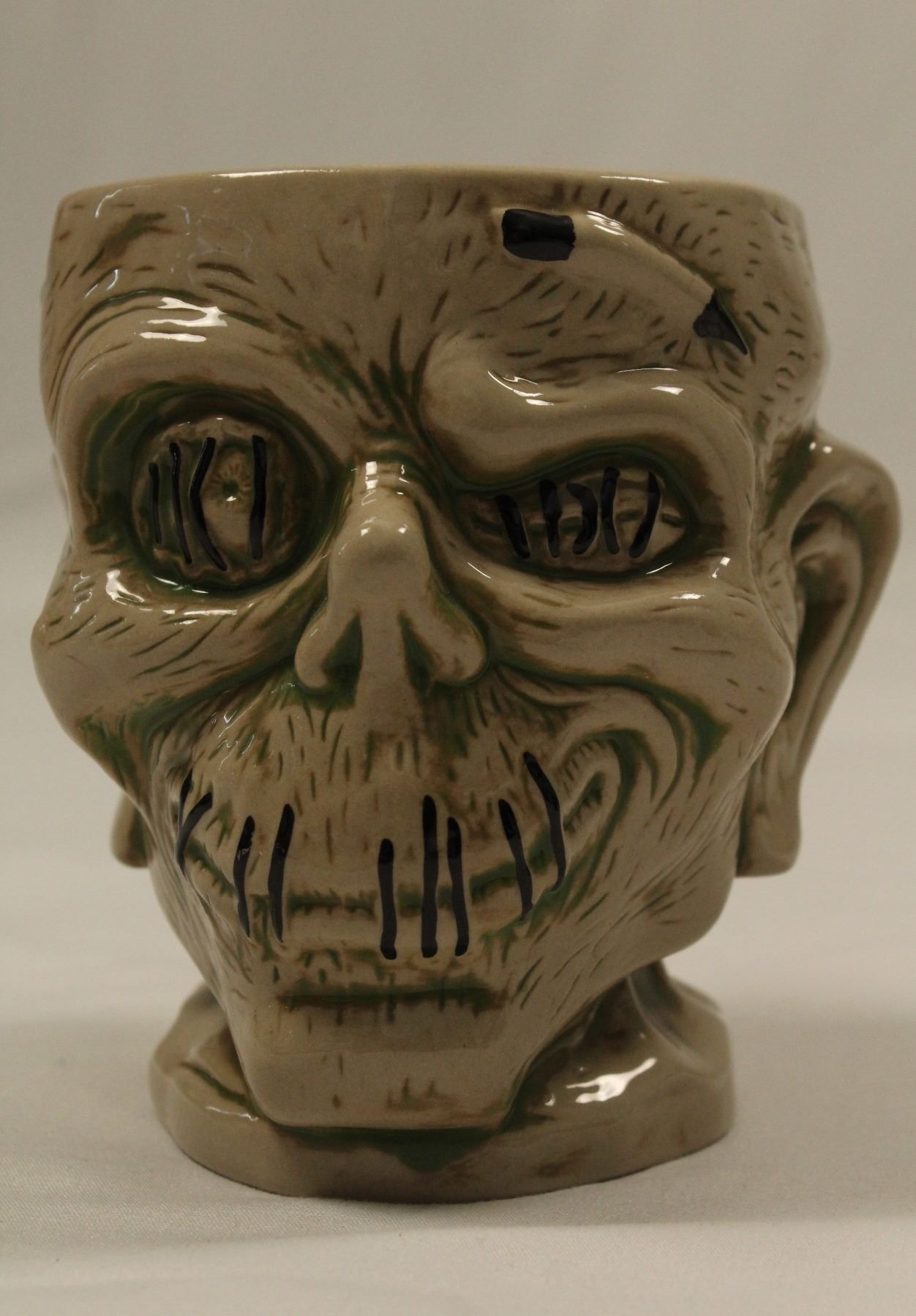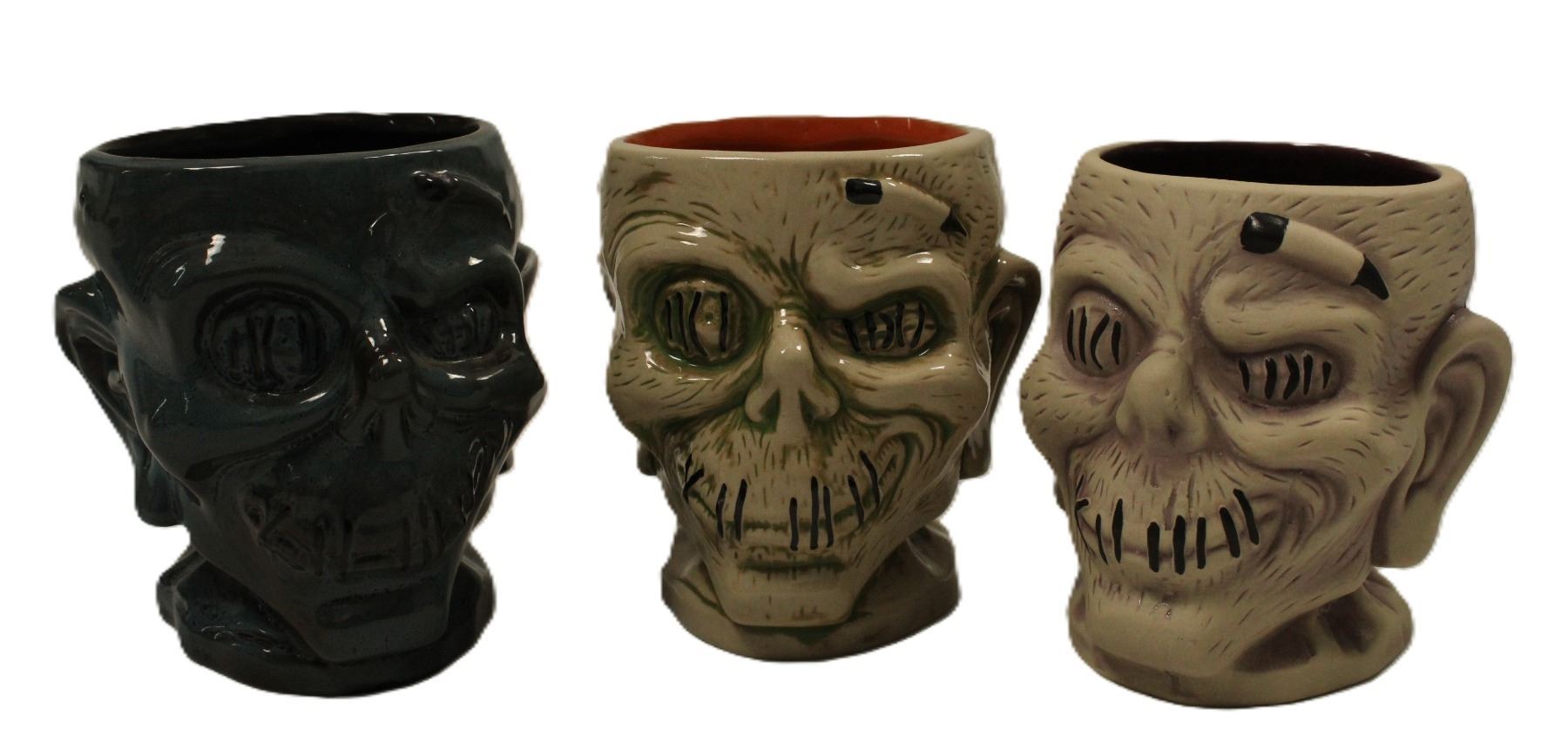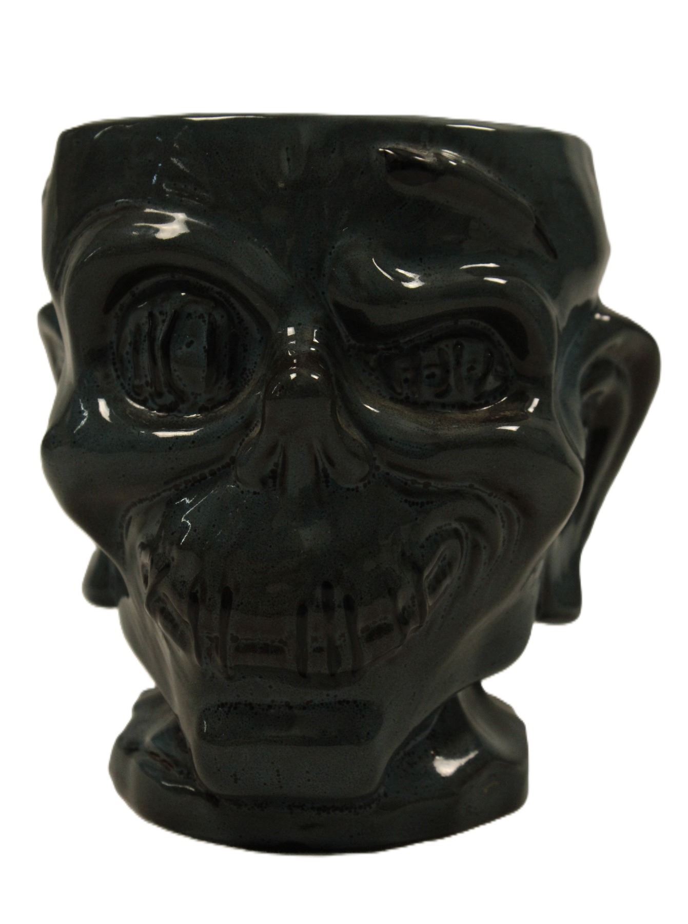 (Disneyland, 2011) A trio of ceramic tiki mugs from Trader Sam's Enchanted Tiki Bar at Disneyland. Used to serve the Zombie cocktail, the pair includes a cobalt blue mug marked 1st Edition on the bottom of the base, a gray and green mug similarly marked 2nd Edition and a gray and purple mug similarly marked "4th Edition" The macabre mugs each measure 4.75" tall and 4.25" deep and are in very fine condition being as-new.