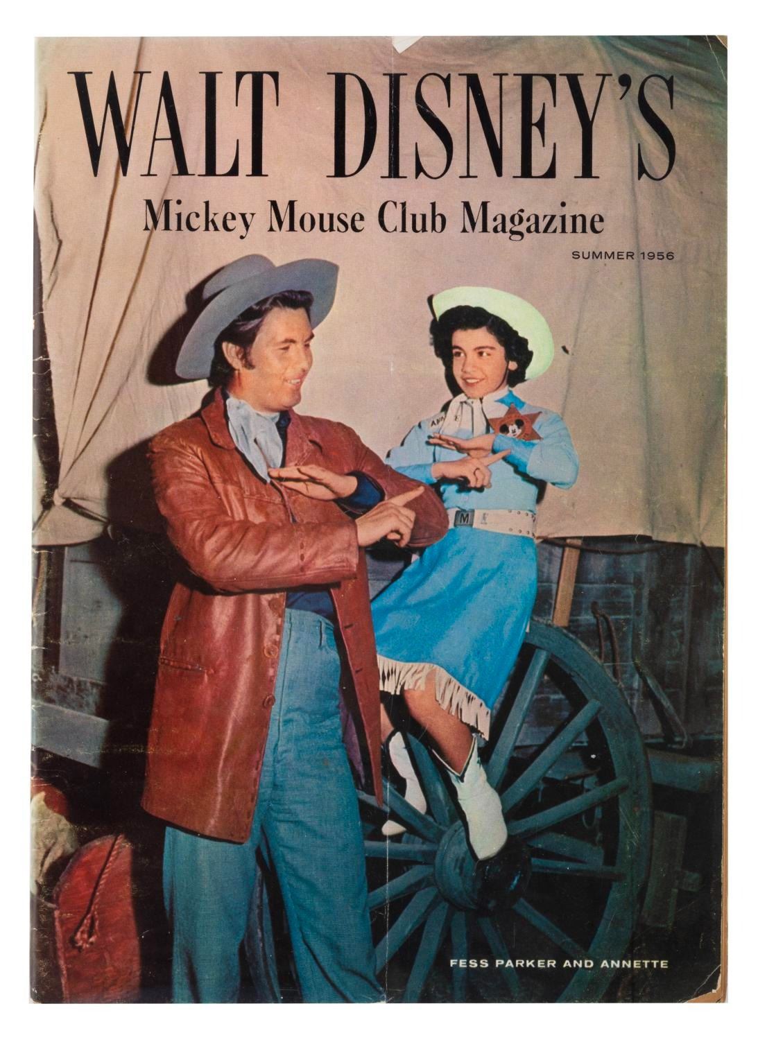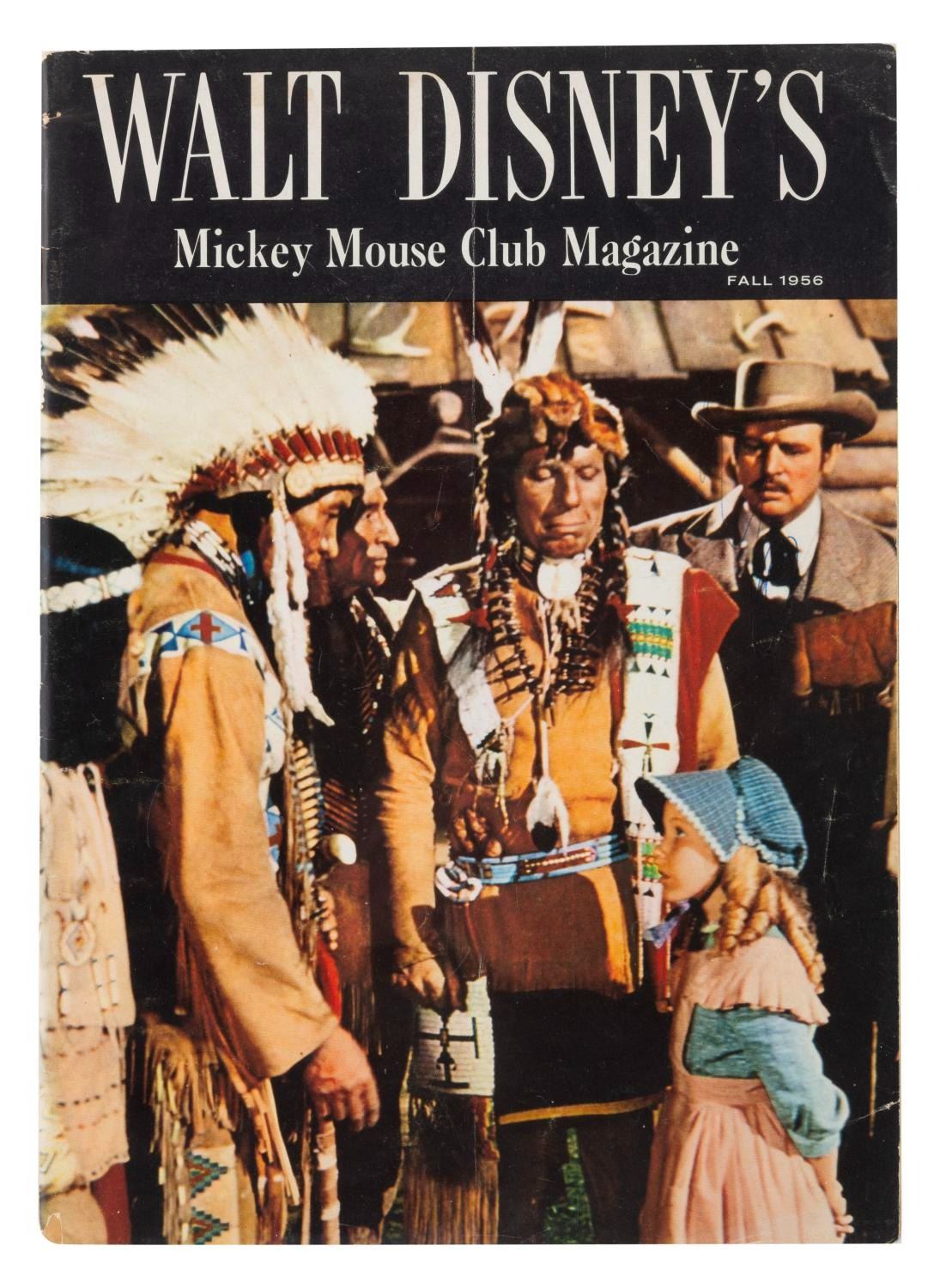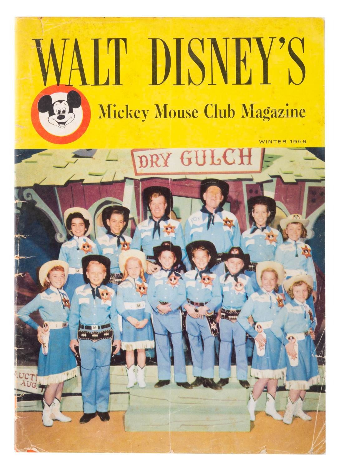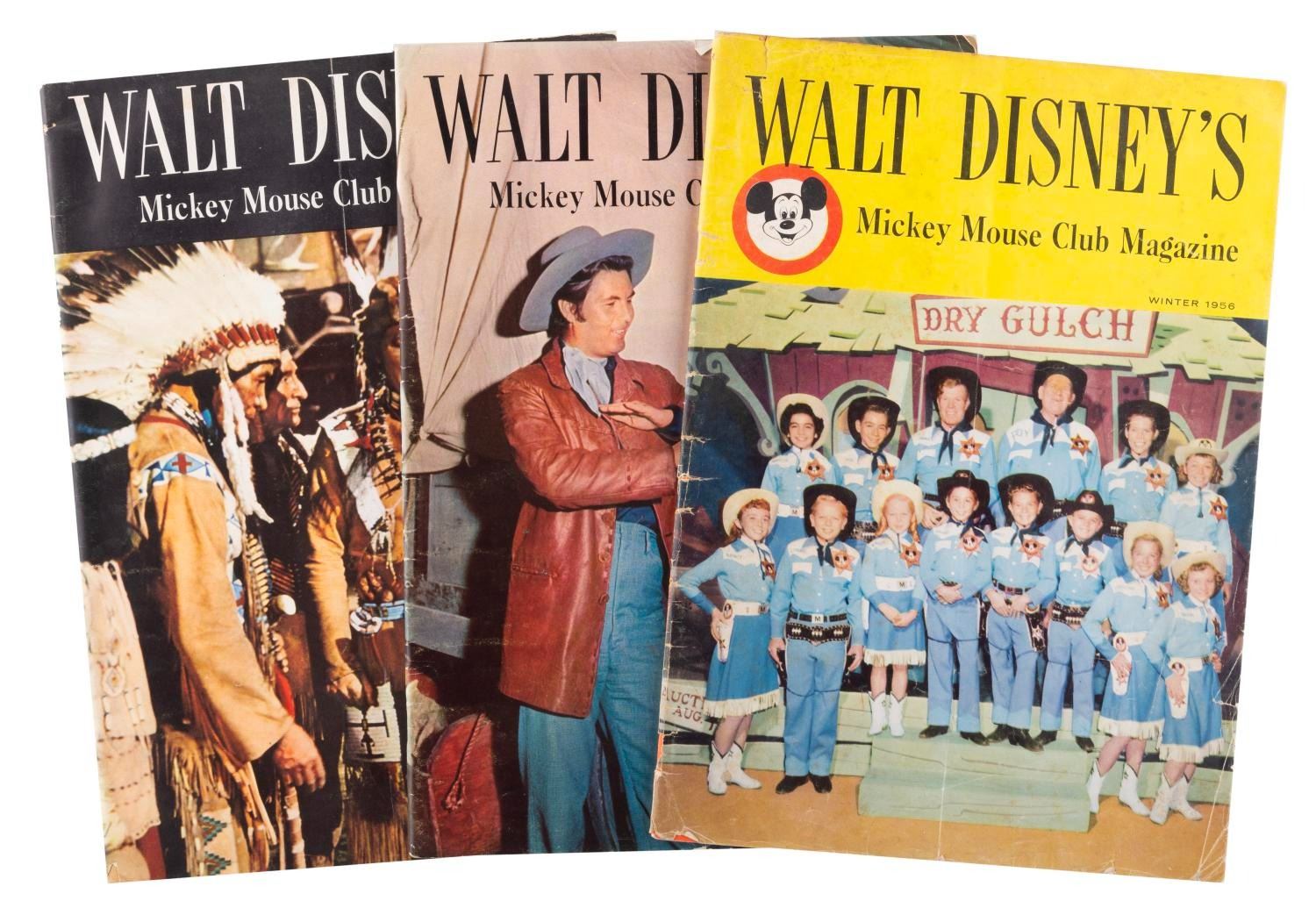 (Disney, 1956) Three Mickey Mouse magazines published in the Summer, Fall, and Winter of 1956. Measuring 8" x 11.5", the magazines are in good condition with pages off-white from age, edge wear, and chipping; and the Winter issue in fair condition, also with spotting.