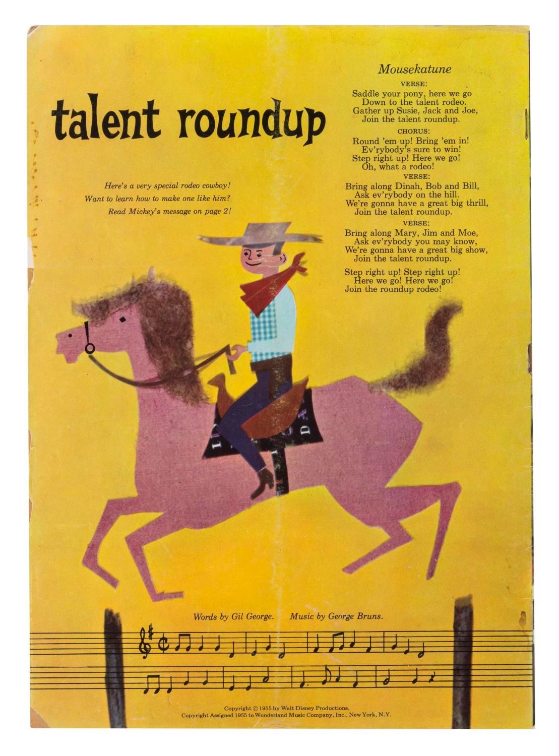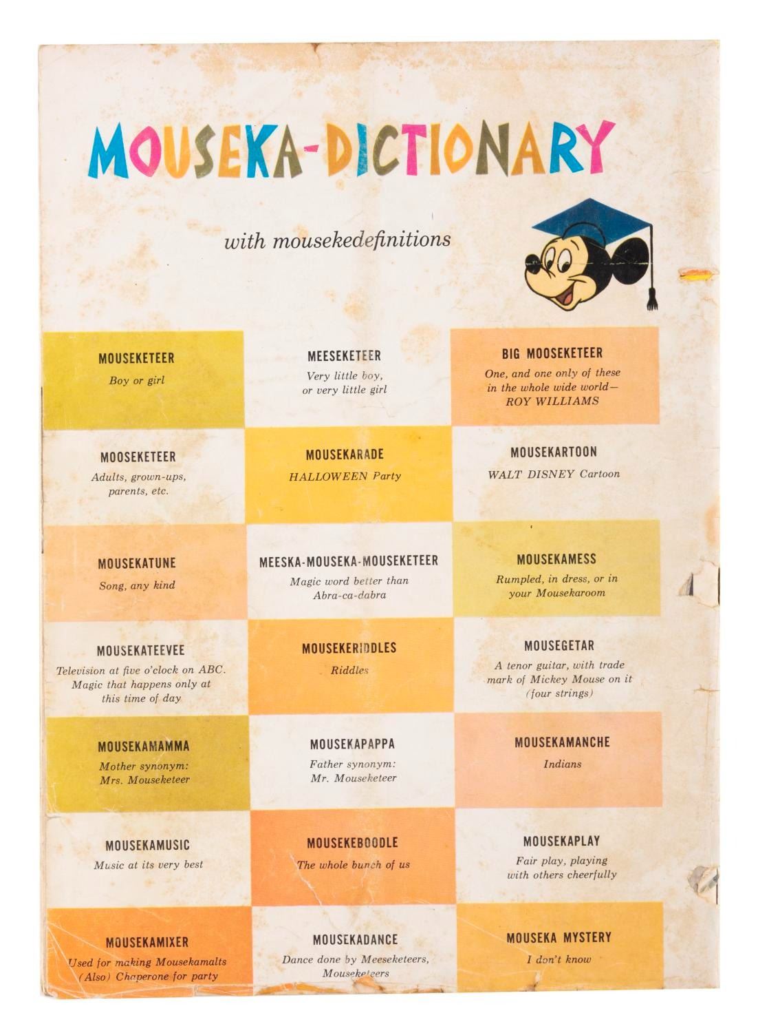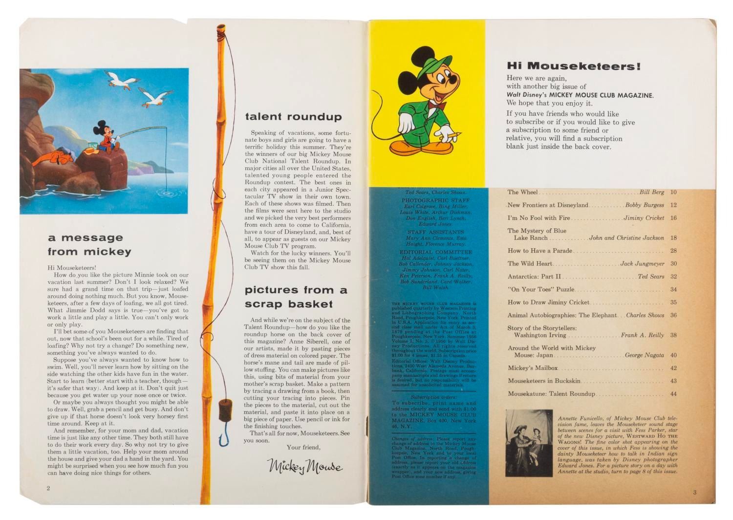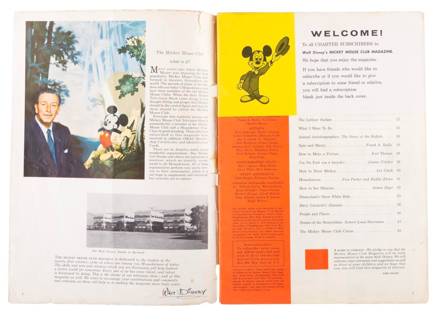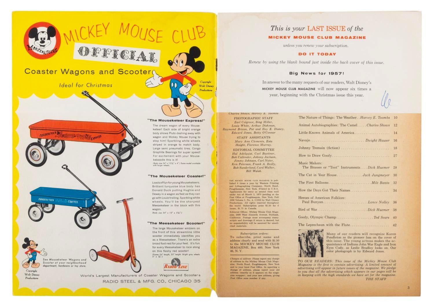 (Disney, 1956) Three Mickey Mouse magazines published in the Summer, Fall, and Winter of 1956. Measuring 8" x 11.5", the magazines are in good condition with pages off-white from age, edge wear, and chipping; and the Winter issue in fair condition, also with spotting.
