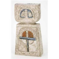 A Troika vase, cup on pedestal form incised and painted with geometric devices, painted mark Troika, Cornwall, circa.1970 £300-500