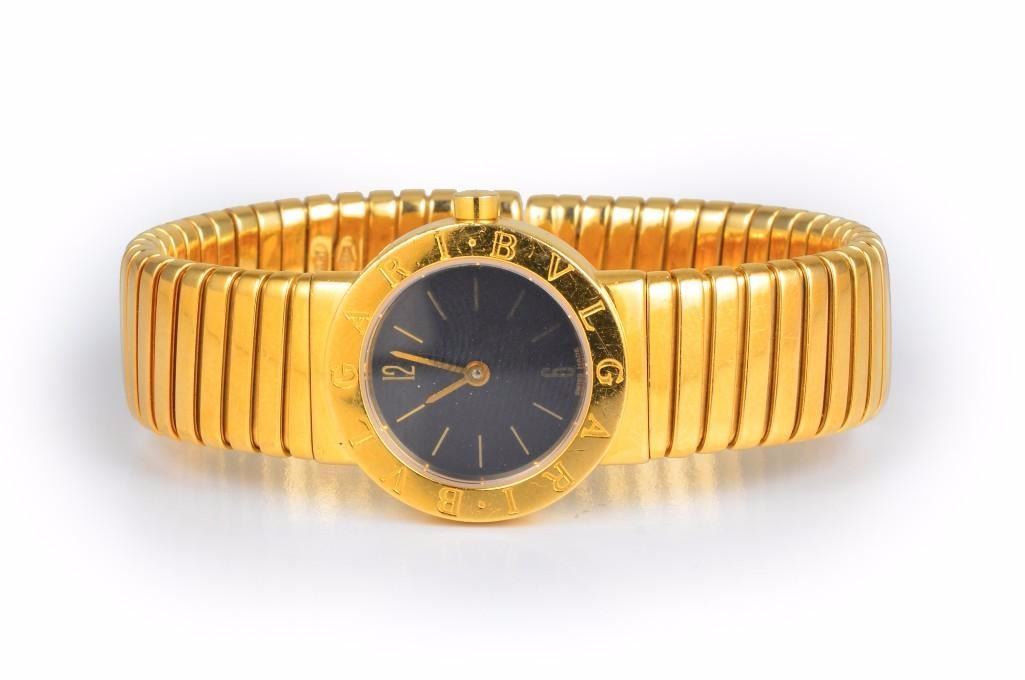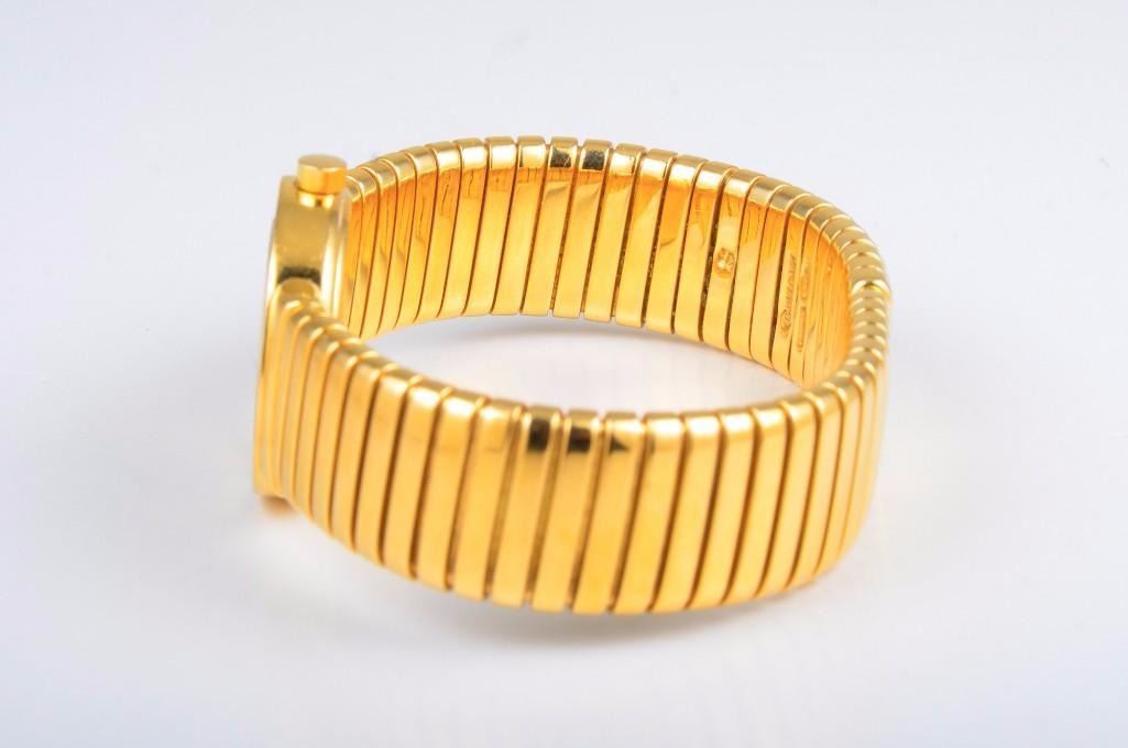Crafted using 18K gold with a black dial, gold-toned hands and index hour markers; dial diameter is approximately 1 inch; inside circumference (flexible) is 5-1/2 inches; weight 76.4g.