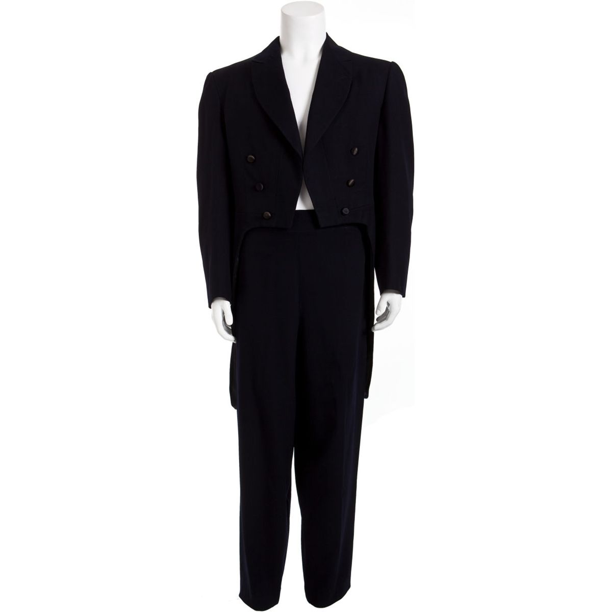 A Tuxedo from "Lady from Louisiana." Republic, 1941. A black wool tailcoat, traditional cut, rounded lapels, Western Costume Co. label reads "John Wayne #5," further WCC stamps on lining and inside sleeve; together with a pair of formal pants, WCC label reads "John Wayne / Waist 30 1/2/ Inseam 34 1/2," further WCC stamps on inside waistband; worn as Wayne portrayed "John Reynolds" in the film that co-starred Ona Munson and Dorothy Dandridge.