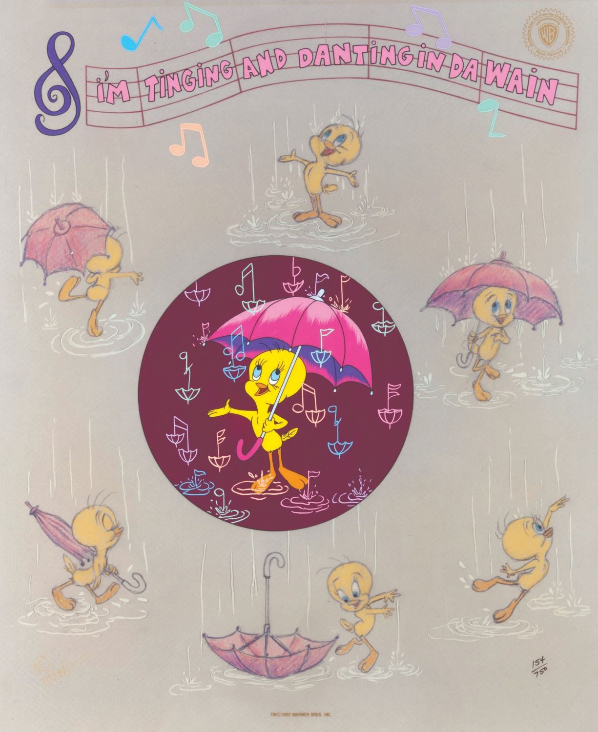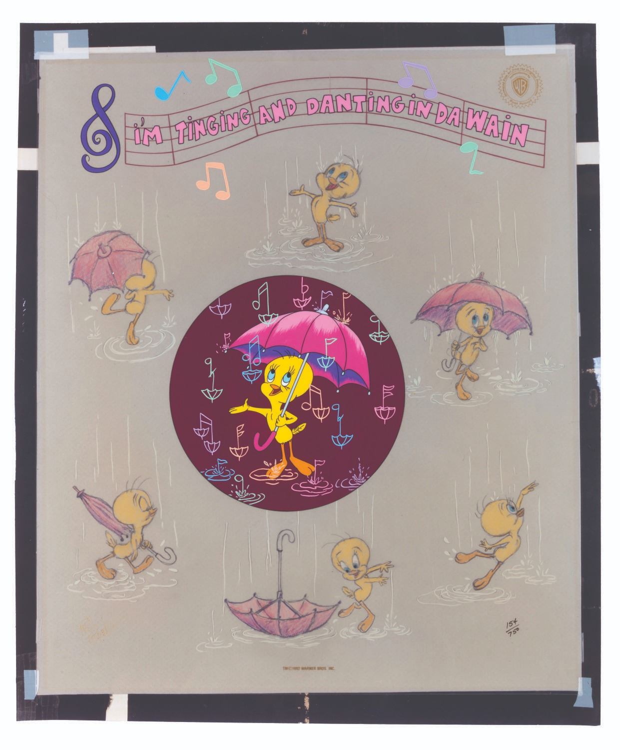 (Warner Bros., 1992) A Tweety Bird limited edition “Singin’ in the Rain”-stye hand-painted cel, numbered 154/750. With an image size of 15.5” x 15.5” on an 18.5” x 22” cel, the art is in good condition with scratches, scuffs, and wear.