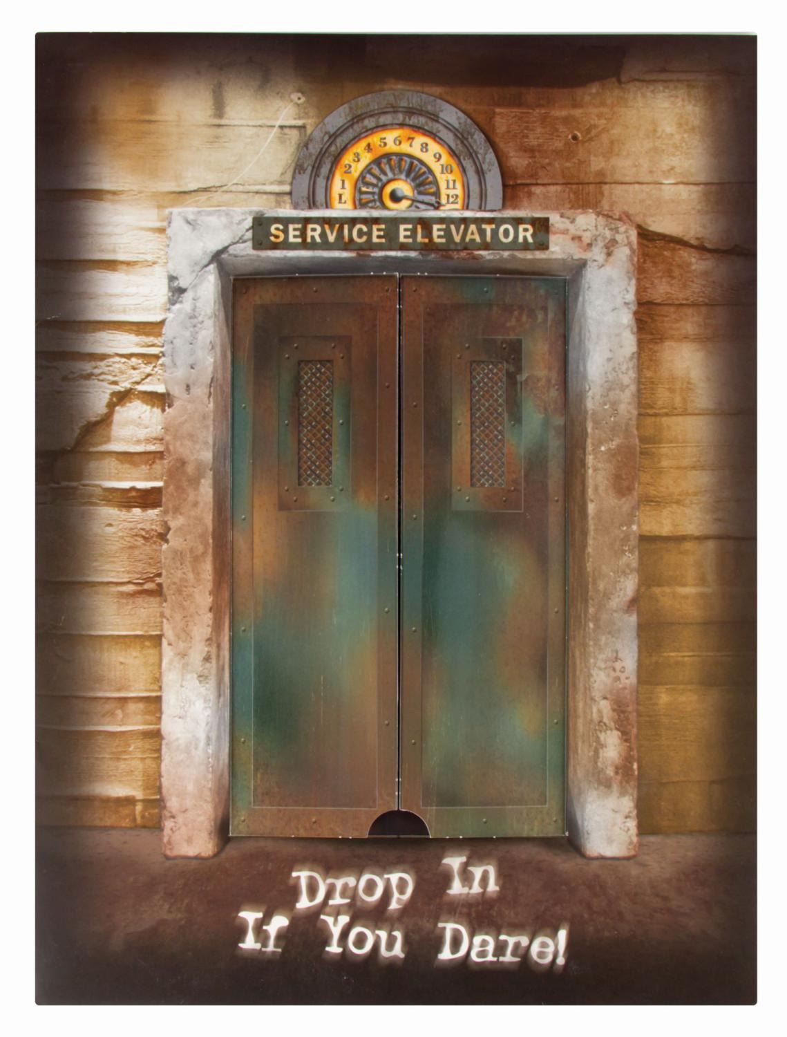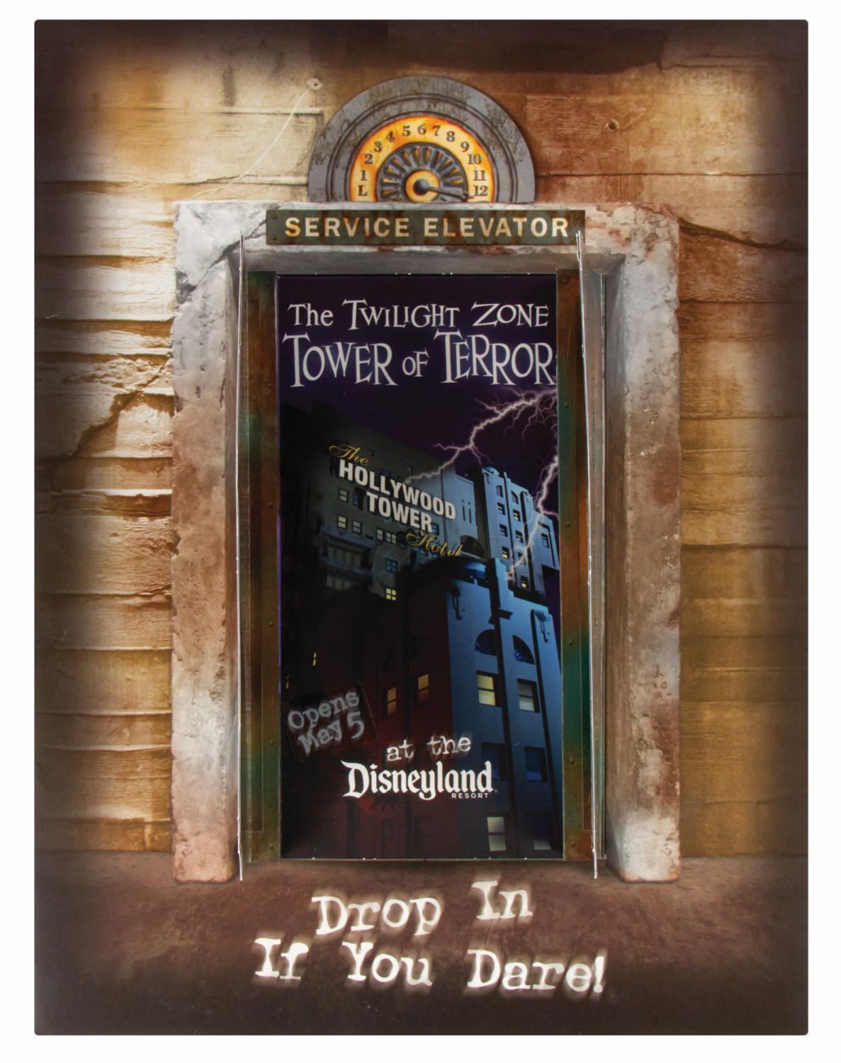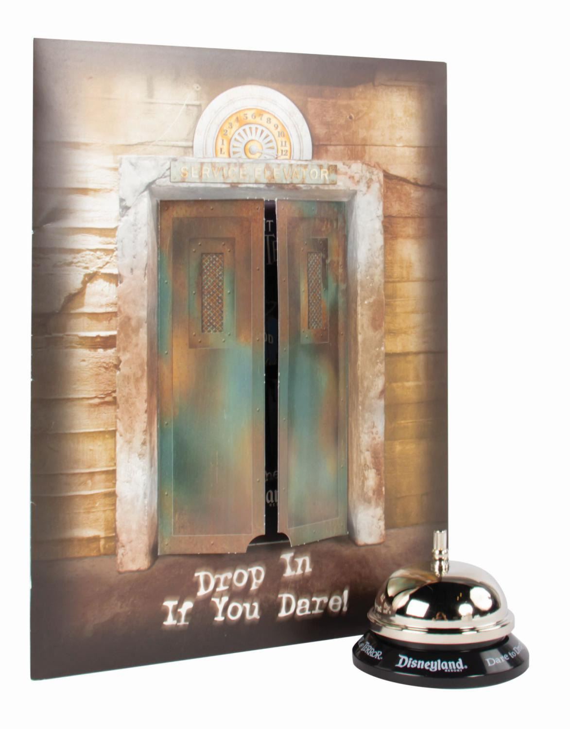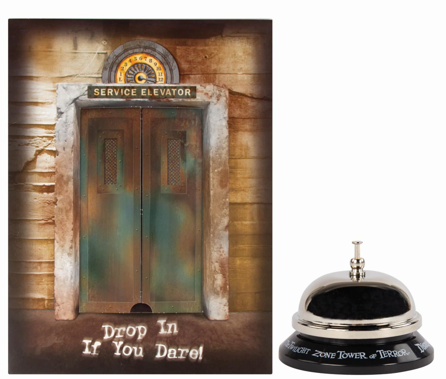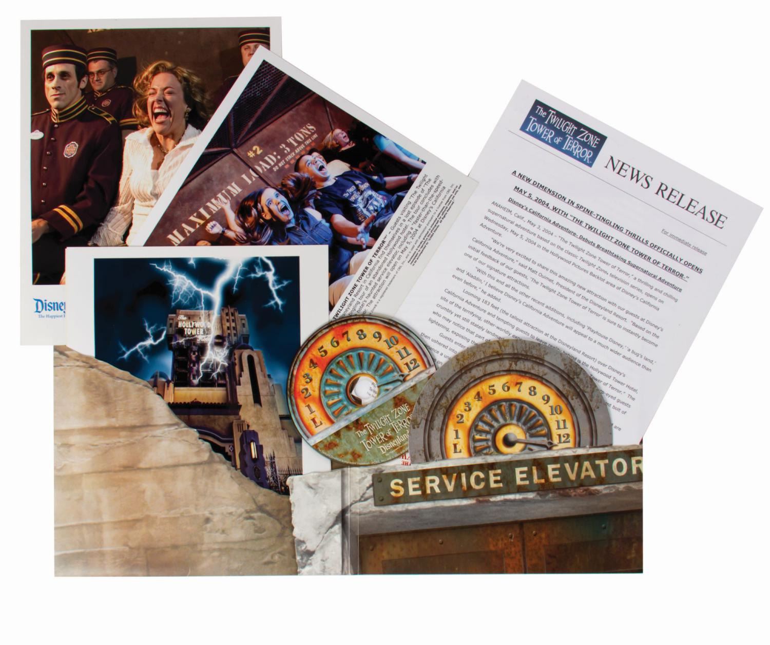 (Disney's California Adventure, 2004) A very rare press kit from the grand opening of California Adventure's The Twilight Zone Tower of Terror. The kit includes an outer folder that opens at the front doors, and originally played audio but the battery has since died. Also included are (4) color press photos, a logo decal, a CD, (5) sample news releases, and a commemorative bell that still plays spooky audio when pressed. The folder measures 12"x9" and the bell measures 3.5" in diameter and 2.5" tall. The condition is good overall with some edge wear to the folder from use.