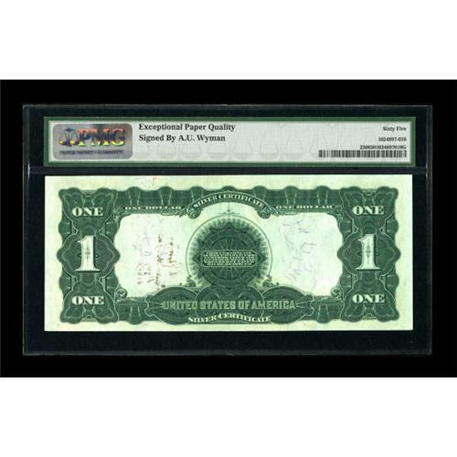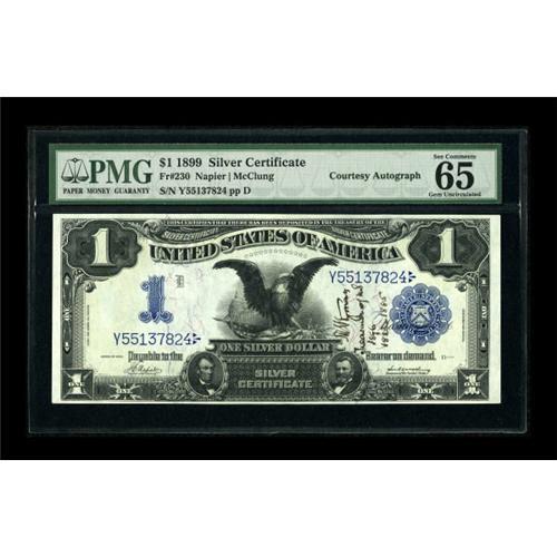 <B>A.U. Wyman Courtesy Autograph Fr. 230 $1 1899 Silver Certificate PMG Gem Uncirculated 65 EPQ.</B></I> Treasurer A.U. Wyman autographed these notes with his office position and dates of service to the right of the eagle. This is the D plate position of the only four notes he autographed of this Friedberg number. It is also the second of four with his autograph of this Friedberg number in this auction.<BR><BR><b>Shipping:</b> Coins & Currency (<a target="_blank" href="http://www.heritageauctions.com/common/shipping.php">view shipping information</a>)