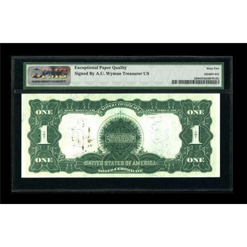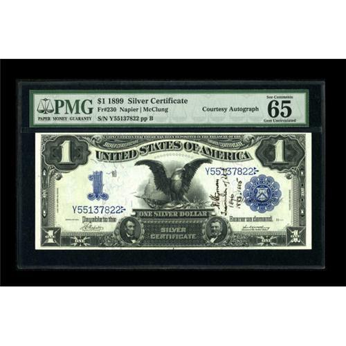 <B>A.U. Wyman Courtesy Autograph Fr. 230 $1 1899 Silver Certificate PMG Gem Uncirculated 65 EPQ.</B></I> These Wyman autographed notes of Fr. 230 last crossed the auction block a dozen years ago. This B plate letter note is EPQ in all respects.<BR><BR><b>Shipping:</b> Coins & Currency (<a target="_blank" href="http://www.heritageauctions.com/common/shipping.php">view shipping information</a>)