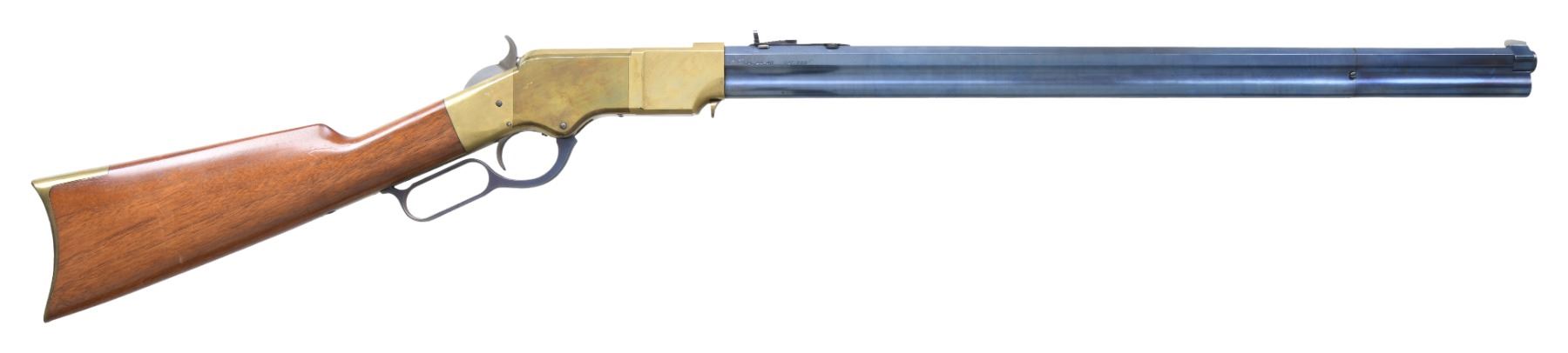 Cal. 44-40. S# 01828 (AL = 1983). Mfg. in Italy as Cat. #1559. Barrel 24.25" w/ integral 13 shot mag. Blade front & replacement folding leaf rear sight. Brass finished frame. Walnut buttstock with crescent buttplate & left side sling swivel. CONDITION: near excellent blue & wood finish showing light handling marks. Brass shows layer of preservative lacquer acquiring patina along with worn brass on left side & scratches on right. Very good bore. (25-199/MD). MODERN. $700-1,000.