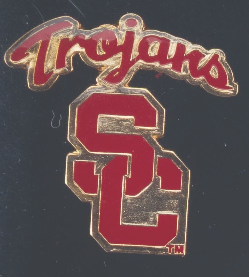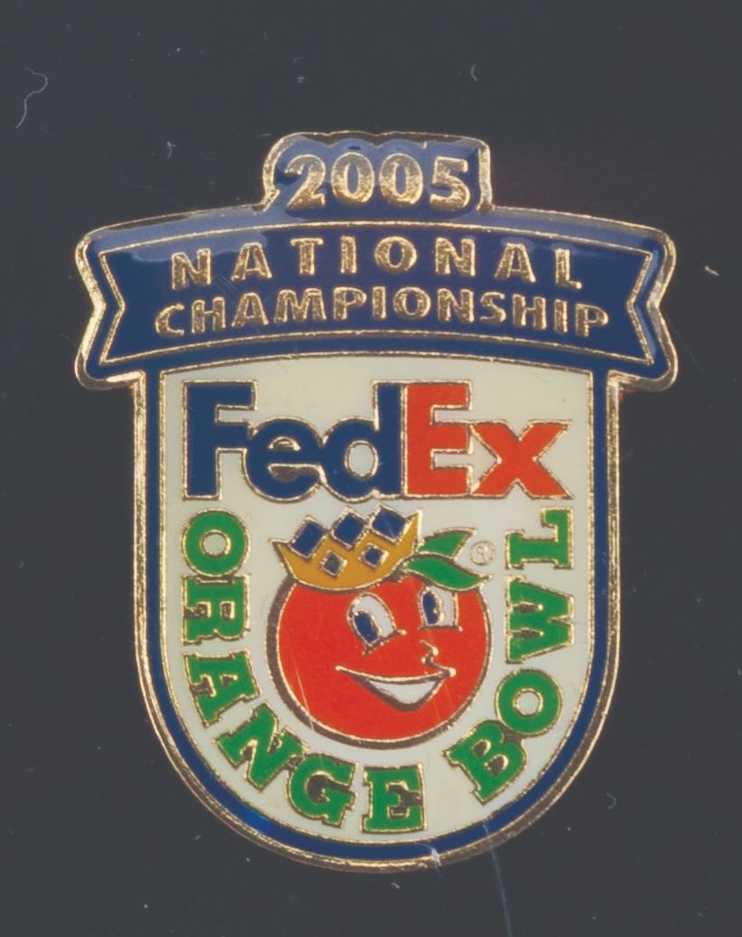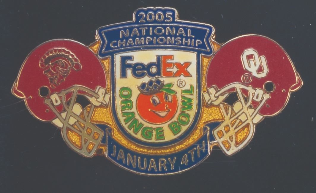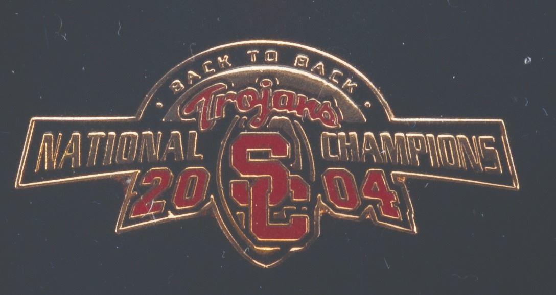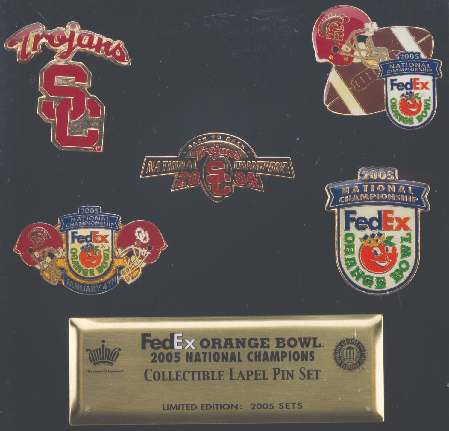 (Aminco, 2005) A pin set commemorating USC’s National Championship victory over the Oklahoma Sooners in the 2005 Orange Bowl, released in a limited edition of 2005. Ranging in size from 0.5” x 1.75” to 1.25” x 1.75” and sealed in their original 5” x 5” case, the pins are in fine condition, while the case displays in very good condition with light scratches and wear.