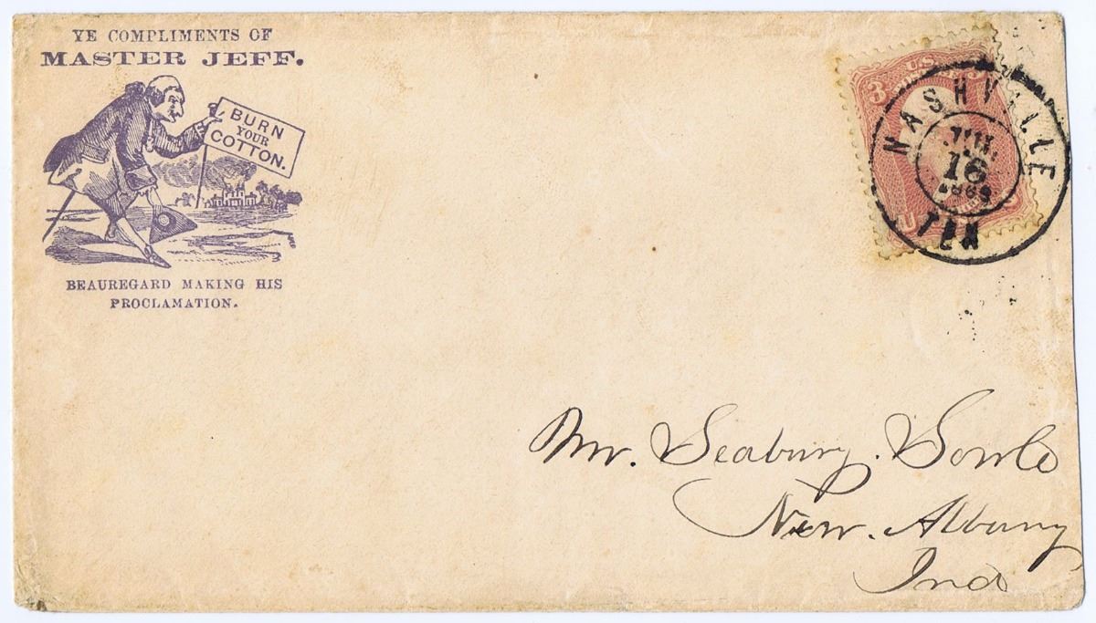 Lilac cornercard cartoon, "Ye Compliments of Master Jeff," depicting caricatured Beauregard dipping his three-cornered hat, holding a placard "Burn your Cotton," as flames consume buildings in the background. Captioned, "Beauregard making his proclamation." Scott #65 rose, complete full-black Nashville c.d.s., Jul(y) 16, 1863. To Seabury Soule, New Albany, Ind. Old pencil notation on verso, "W.M. Rawlins, 5-2-(19)39...Not listed in Laurence"; the dealer's hand may be recognizable to a philatelic old-timer. Light marginal staining and wear, slight rounding wear at two lower tips, else about very good. Also unlisted in Weiss. An intriguing find, off the market since the 1960s; the only other finding of this design is a red variant, stamp with short perfs, in a 1964 Robert A. Siegel sale of "A Grand Award Winning Collection of Civil War Postal History," even then termed "a scarce design."