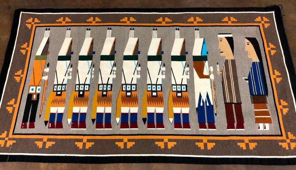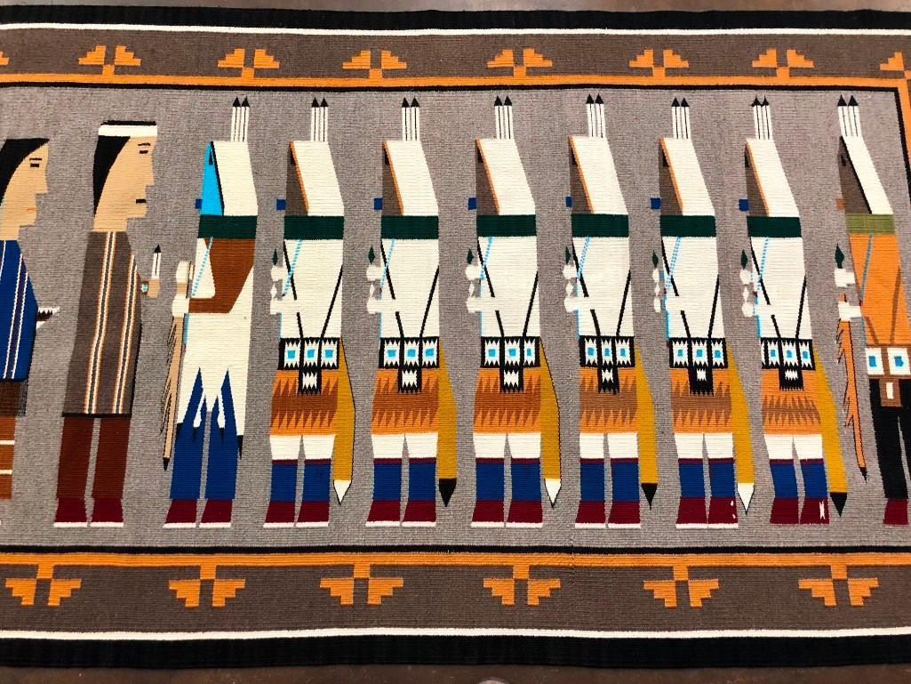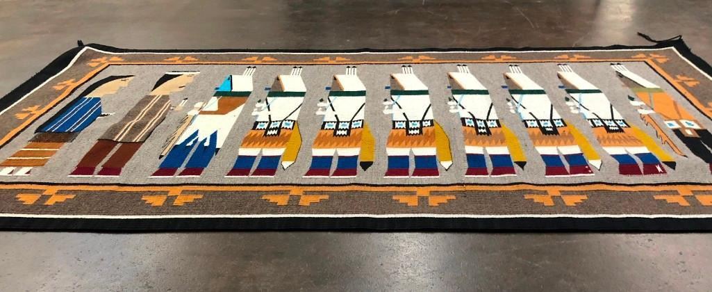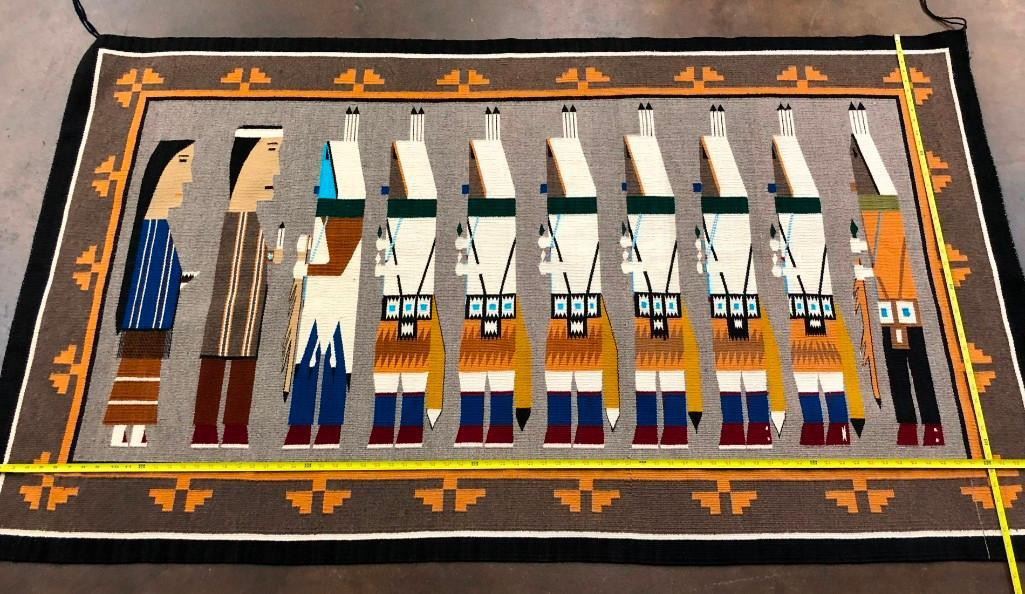 Here is a larger size and beautiful pictorial weaving featuring a ceremony with Yei-ba-chei figures. This is a wonderful hand woven textile and it is very collectible as far as textiles go. Look at the details! It would go nice in your home or business, and of course, in your collection! MAKER: An unknown Navajo weaver. APPROX. AGE: Fairly contemporary. SIZE: Measures a 77-1/2" wide X 44" long. CONDITION: Good for its age, normal wear expected. Please look closely at the pictures as they are an important part of our description and are hereby incorporated into the description, specifically with regards to condition. SHIPPING: There will be a $8 handling / packaging fee for shipping this lot. The actual cost of postage will be added on top of that. BUY IT NOW: If you would like to buy this item now, without waiting for the auction day to bid on it, we do offer this option (which is available up to 48 hours before the actual auction starts). The “Buy it Now†price is the high estimate of this lot (plus applicable fees and the Buyer's premium is discounted to 10% when using the Buy it Now option). If you would like to exercise this option, you must contact us by email (or phone as long as you talk to someone live). Reference this lot number and your intention to "Buy it Now."