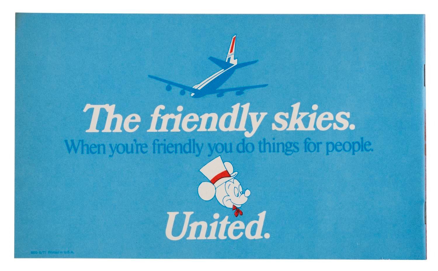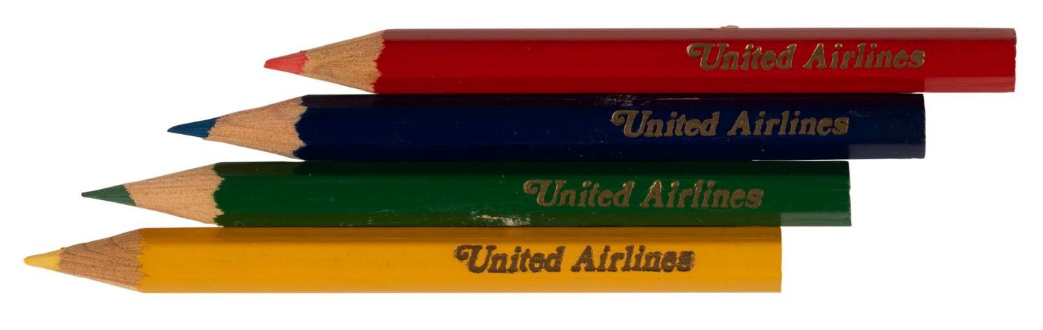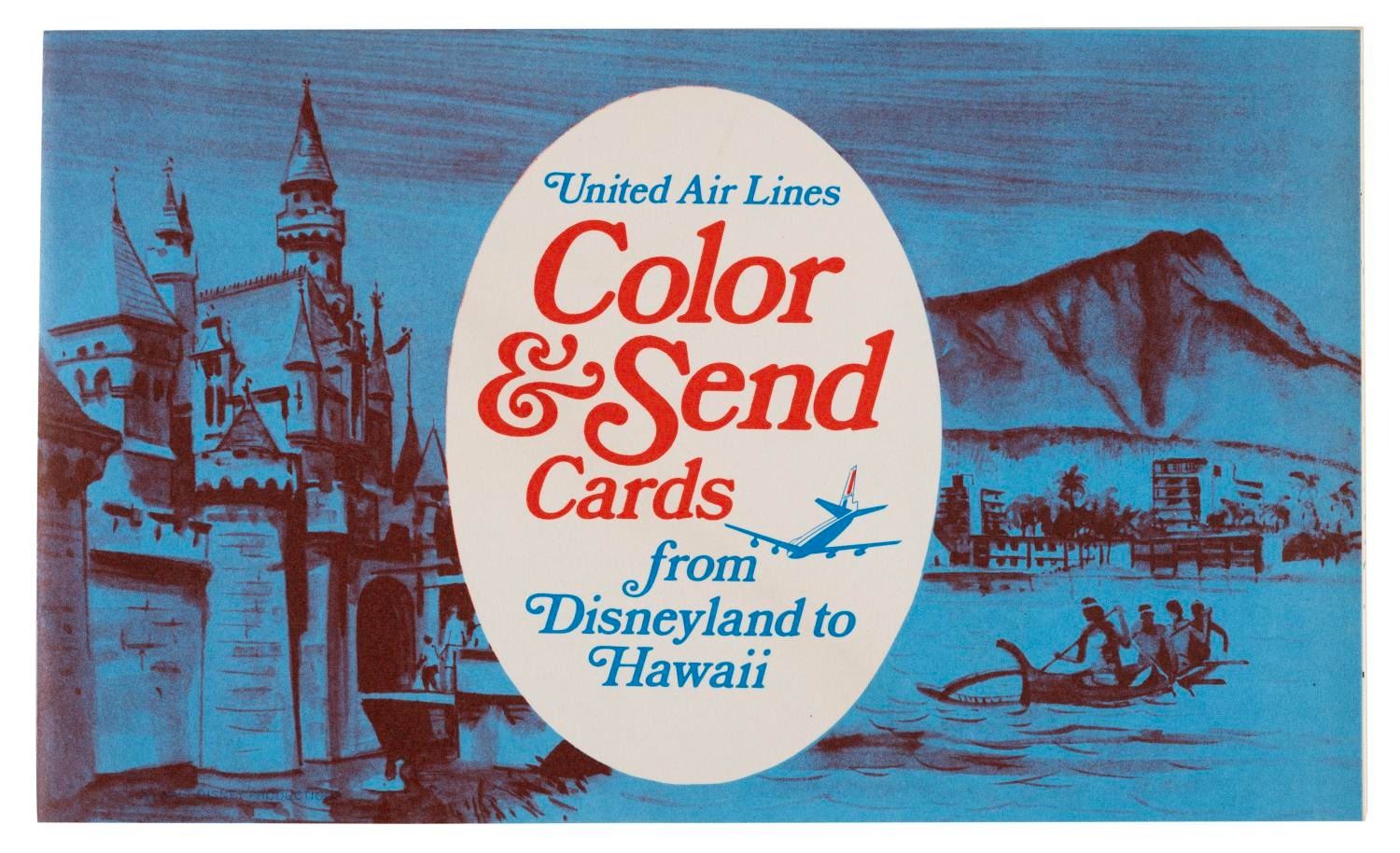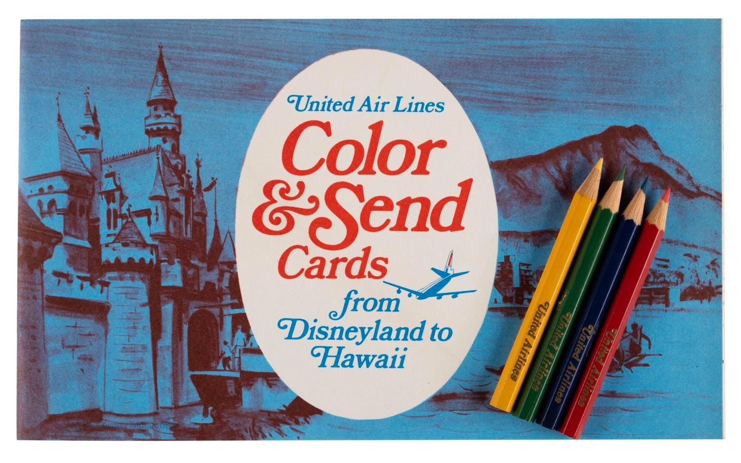 (United Airlines, 1971) A booklet of six "Color & Send Cards From Disneyland to Hawaii" postcards, with four colored pencils marked "United Airlines." The cards feature Disney characters in locations served United. The 5.5" x 9" booklet and 3.5" long pencils are in very good condition with light wear from age.