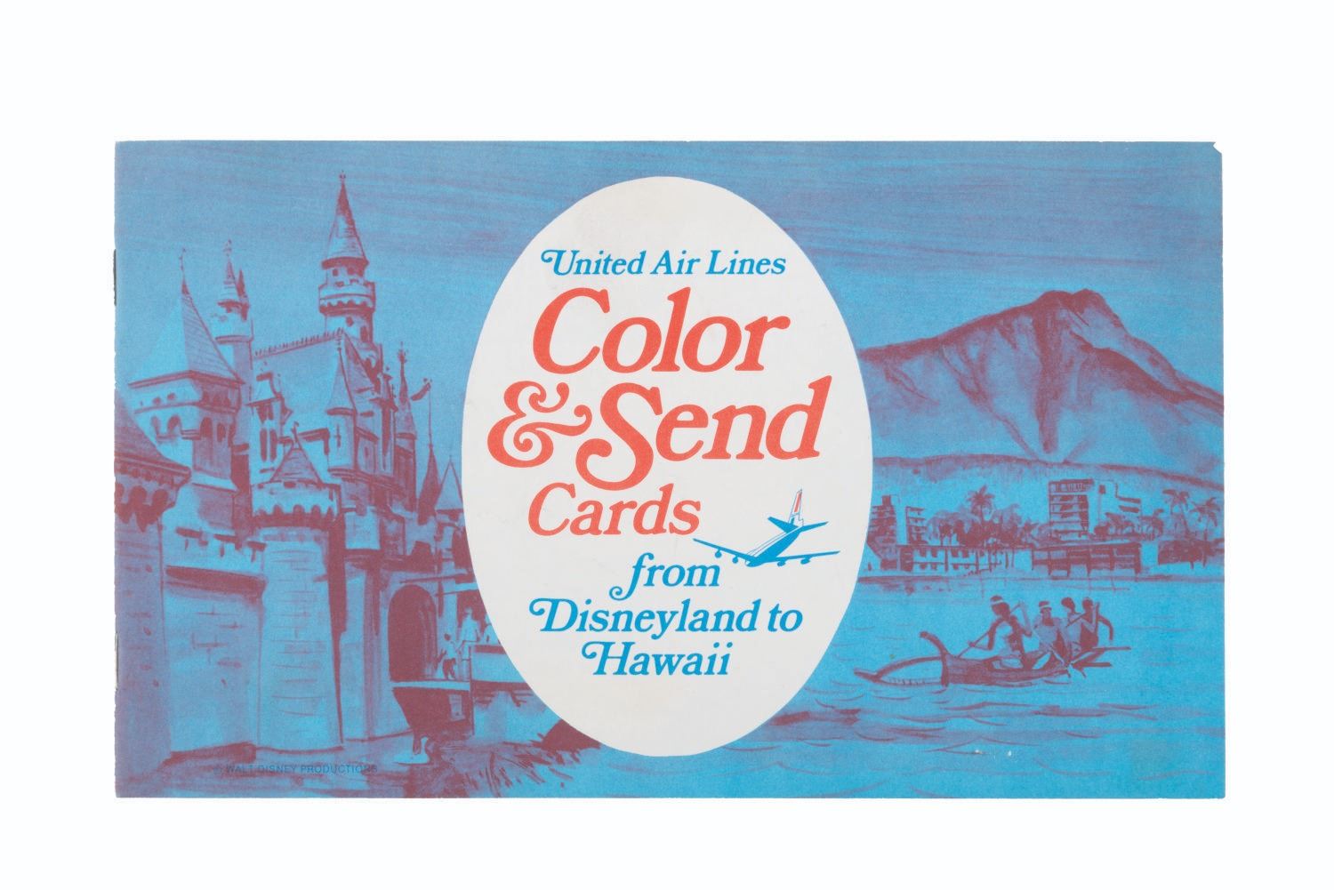 (United Airlines, 1971) A booklet of six"Color & Send Cards From Disneyland to Hawaii" postcards. The cards feature Disney characters in locations served by United. Measuring 5.5" x 9", the booklet is in very good condition with slight tape marks inside the cover, oxidation to the staples, and slight staining to the back cover.