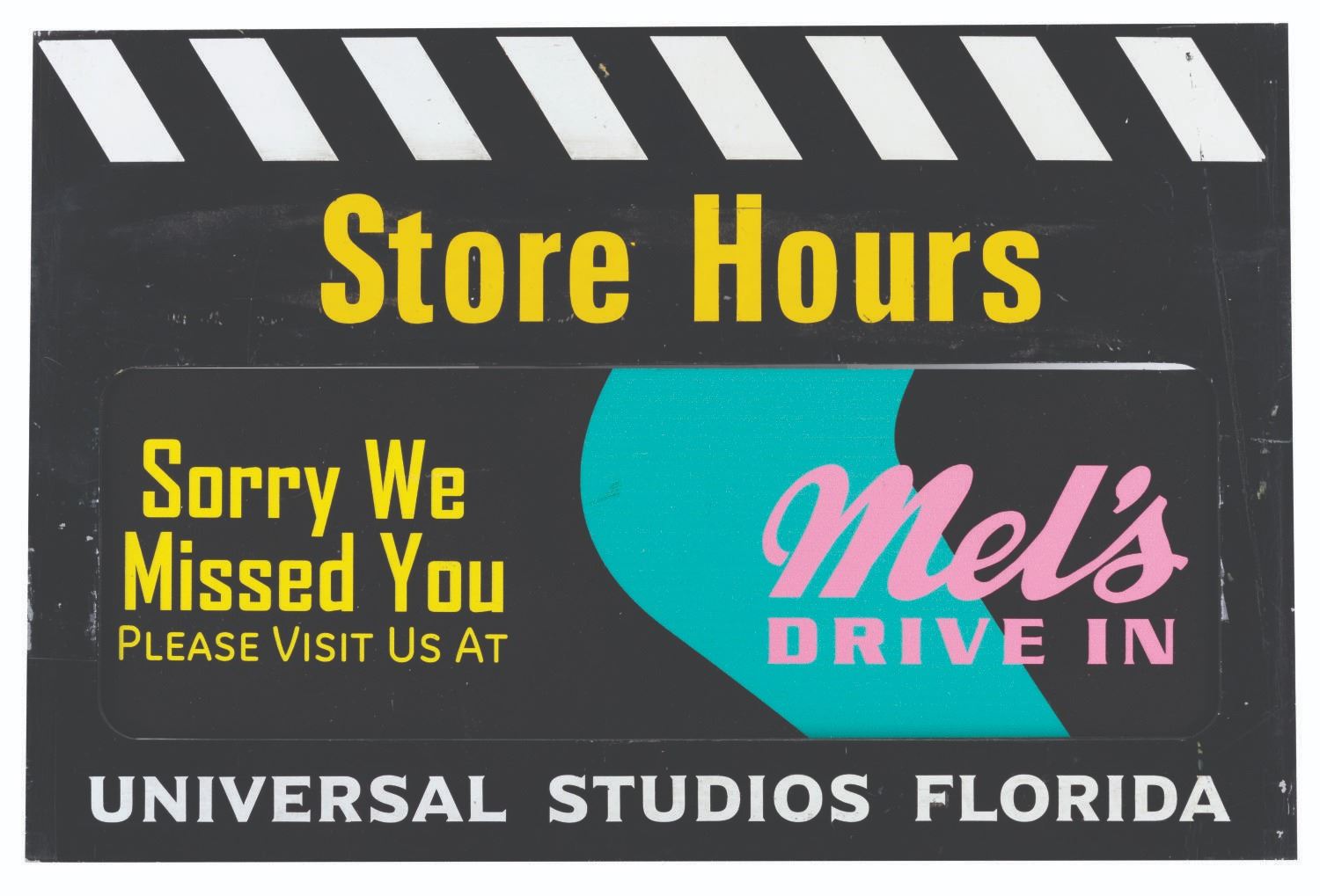 (Universal, 1990s-2000s) A Universal Studios Florida store hours sign for a restaurant near Mel’s Drive-In. The metal sign includes a foam core board that can be slid in and out, displaying "Opens at: 11:30 am” on one side and "Sorry We Missed You, Please Visit Us at Mel’s Drive-In” on the reverse. Measuring 10.5” x 15.5”, the sign displays in good condition with heavy scratches, scuffs, tape residue and wear from park use.