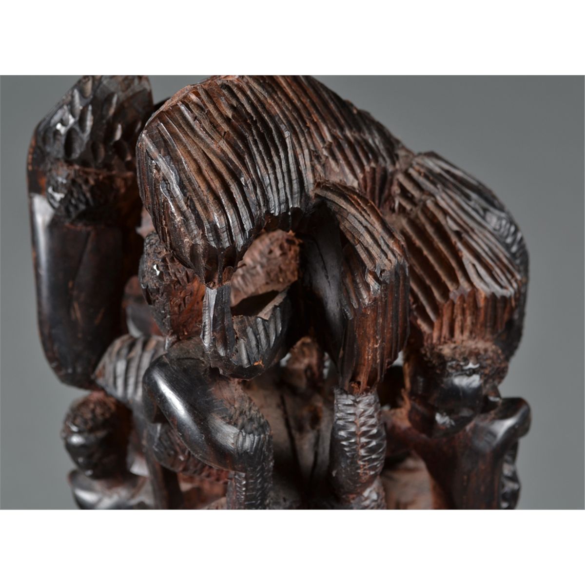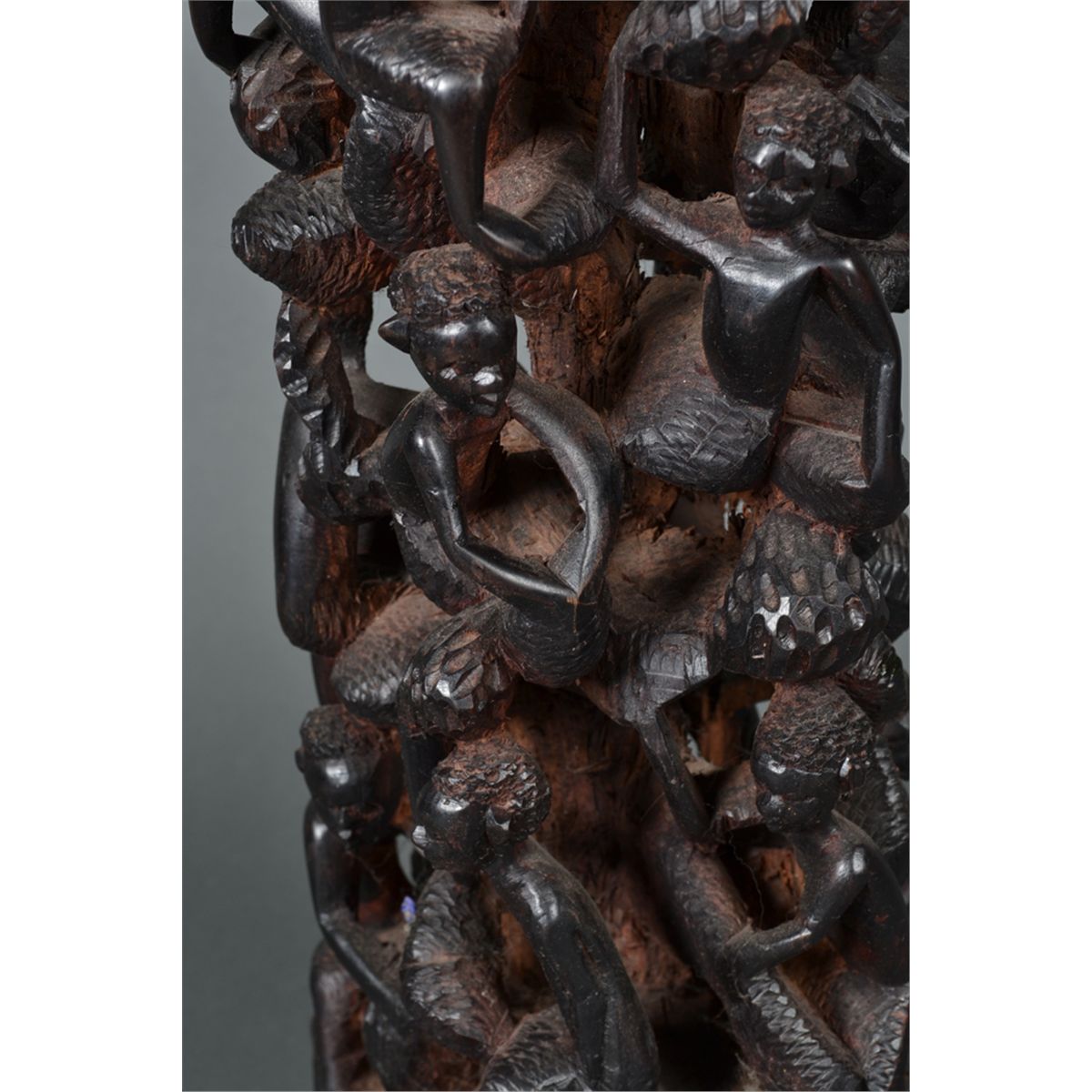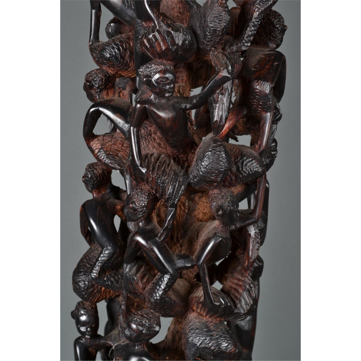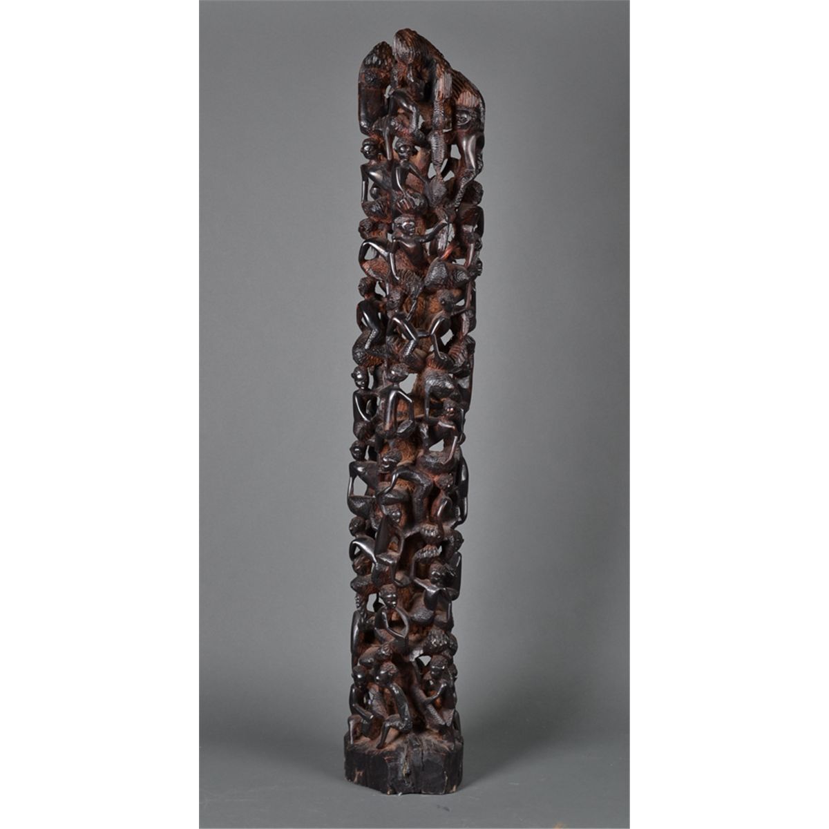 Finely carved to depict multiple figures on top of eachother with openwork in-between. The surface with fine old mellow patina, apparently unsigned. 40" H x 6.5" W, circa early t20th century. Private collection Ft. Gratiot, MI.