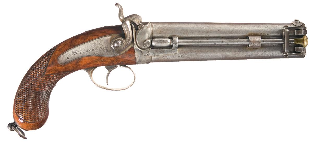 Made as a back-up for big game hinting, this is a fine quality large caliber "Howda" type pistol. Casehardened lock plates with the right lock marked "A.V. LEBEDA" and the left lock marked "IN PRAG". Damascus over under rifled barrels with blade front sight. Double hammers with single trigger. Swivel ramrod mounted on the right side of the barrels. Serial number on the lower barrel and trigger guard. Checkered grip with lanyard ring. Overall length 13 3/4".