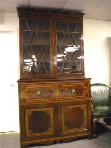 A VERY FINE GEORGE III SATINWOOD-INLAID FIGURED MAHOGANY BUREAU BOOKCASE; English, in two parts, with glazed bookcase doors, the projecting lower section with elaborately inlaid fall-front, to an interior of short drawers, above cupboard doors and bracket feet, minor repairs, feet reduced, 7'8"h x 4'1"w x 23"d
