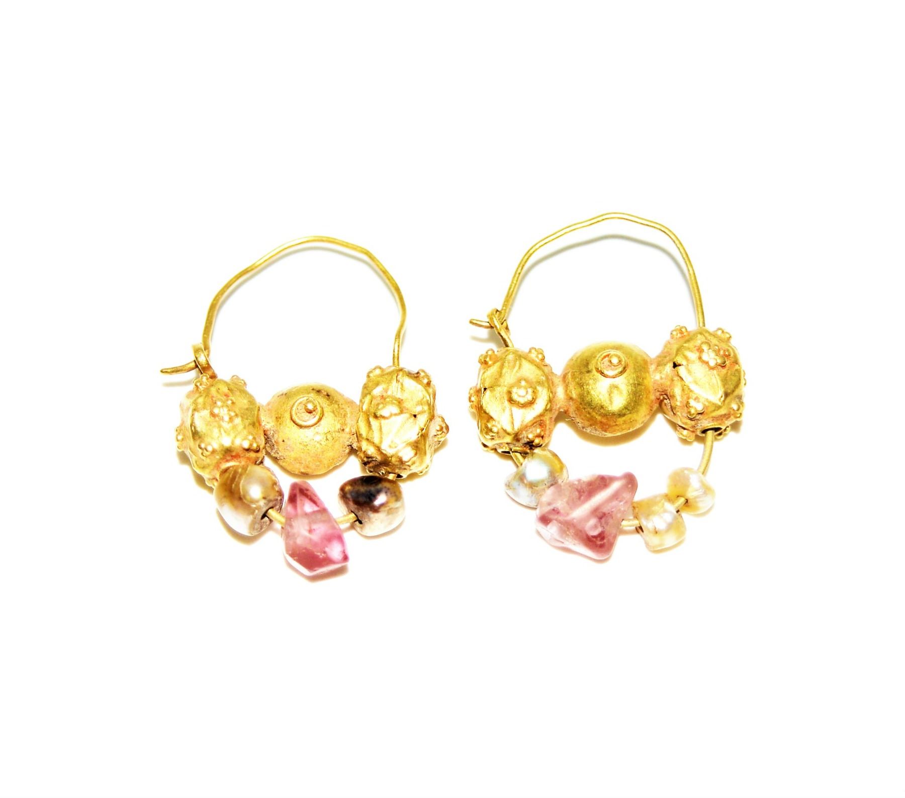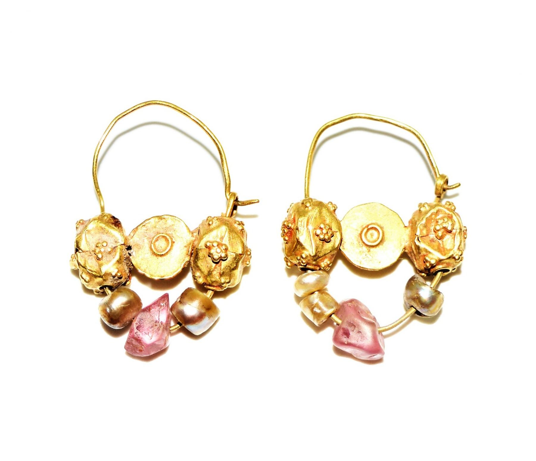 A PAIR OF EXTREMELY RARE ANCIENT ROMAN PEARL & RUBY GOLD EARRINGS, CIRCA 1ST-2ND CENTURY.