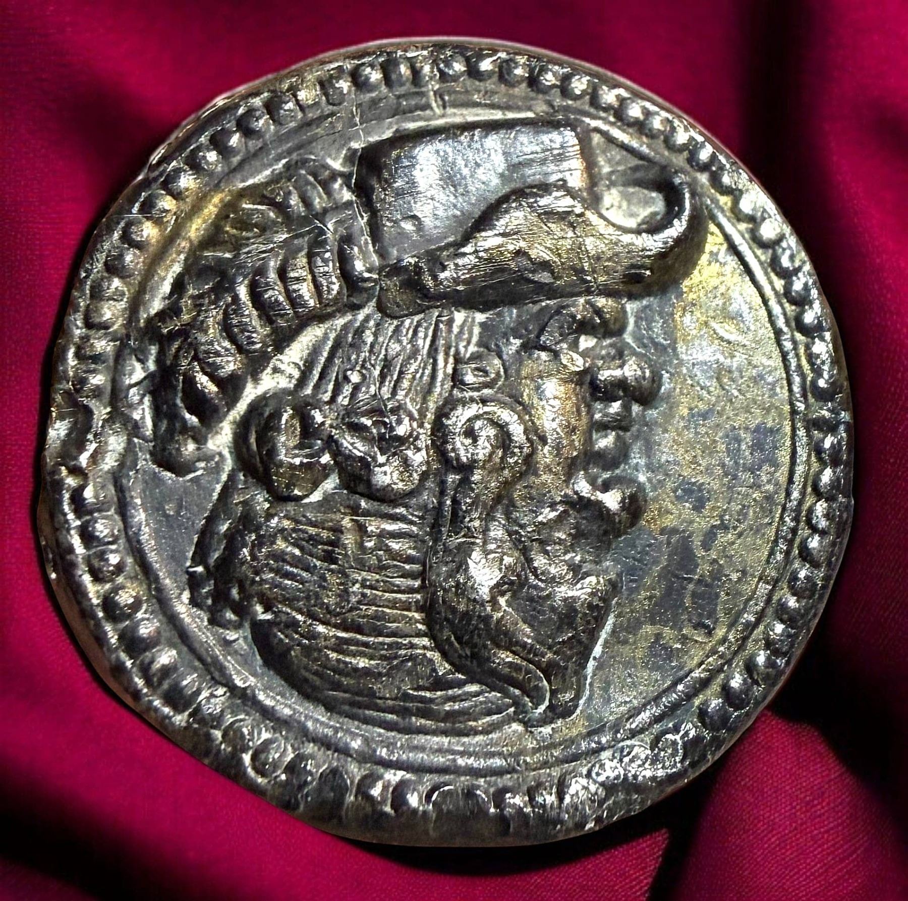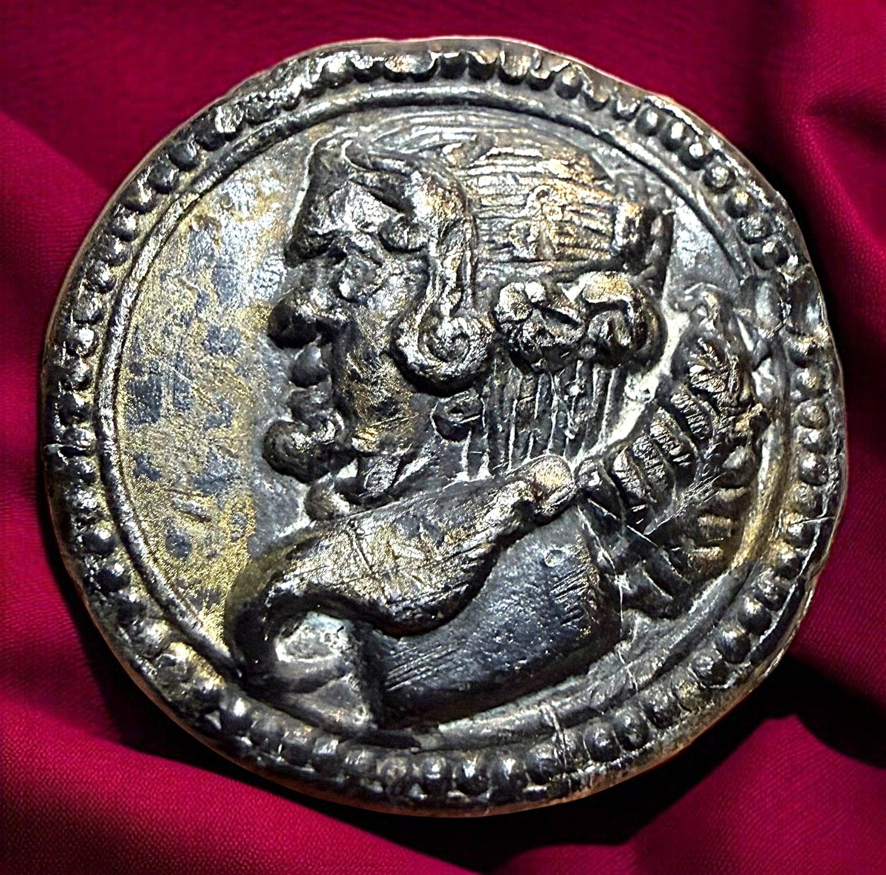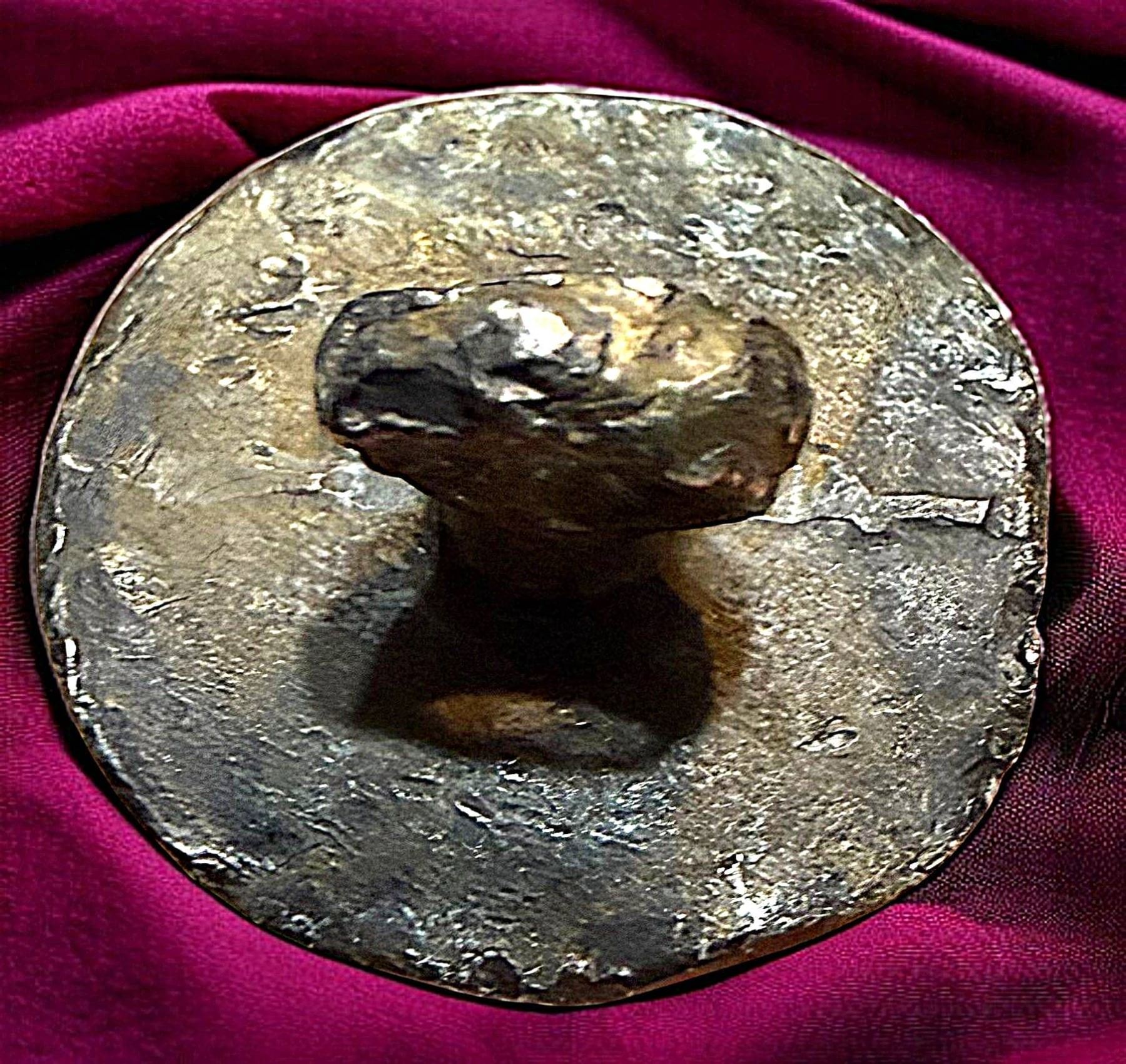 1 Medium size 18th Century pewter "TOPSY TURVEY" example. This is perhaps one of the rarest buttons I n the auction and the late Jeff Lee of Ohio paid dearly to acquire it many years ago. This button is rarer than the 18th century Topsy Turvey on natural material under glass like the one we sold in our October 2025 auction. Topsy Turvey means two heads in one, when you turn it upside down you view a different head. Both heads are designed into one design and is a trick looking button. This medium 18th century example was hand crafted in the 18th century and as said very, very rare.