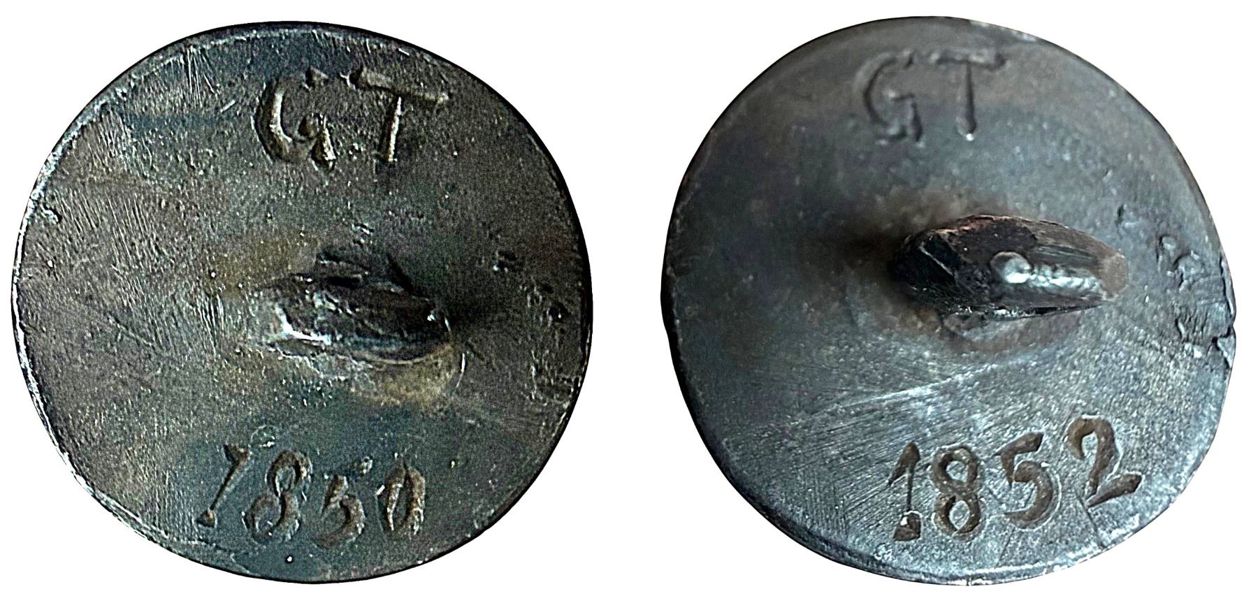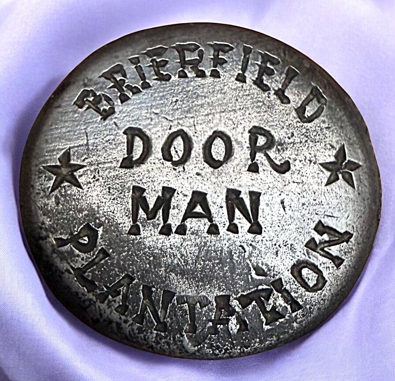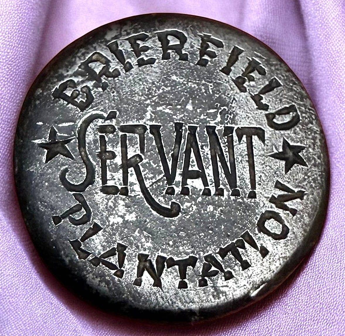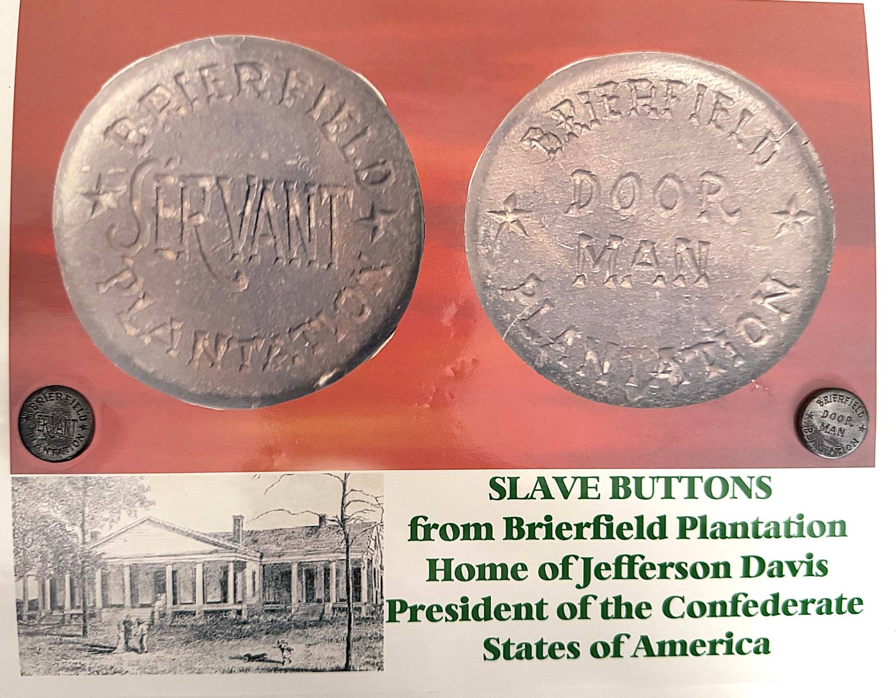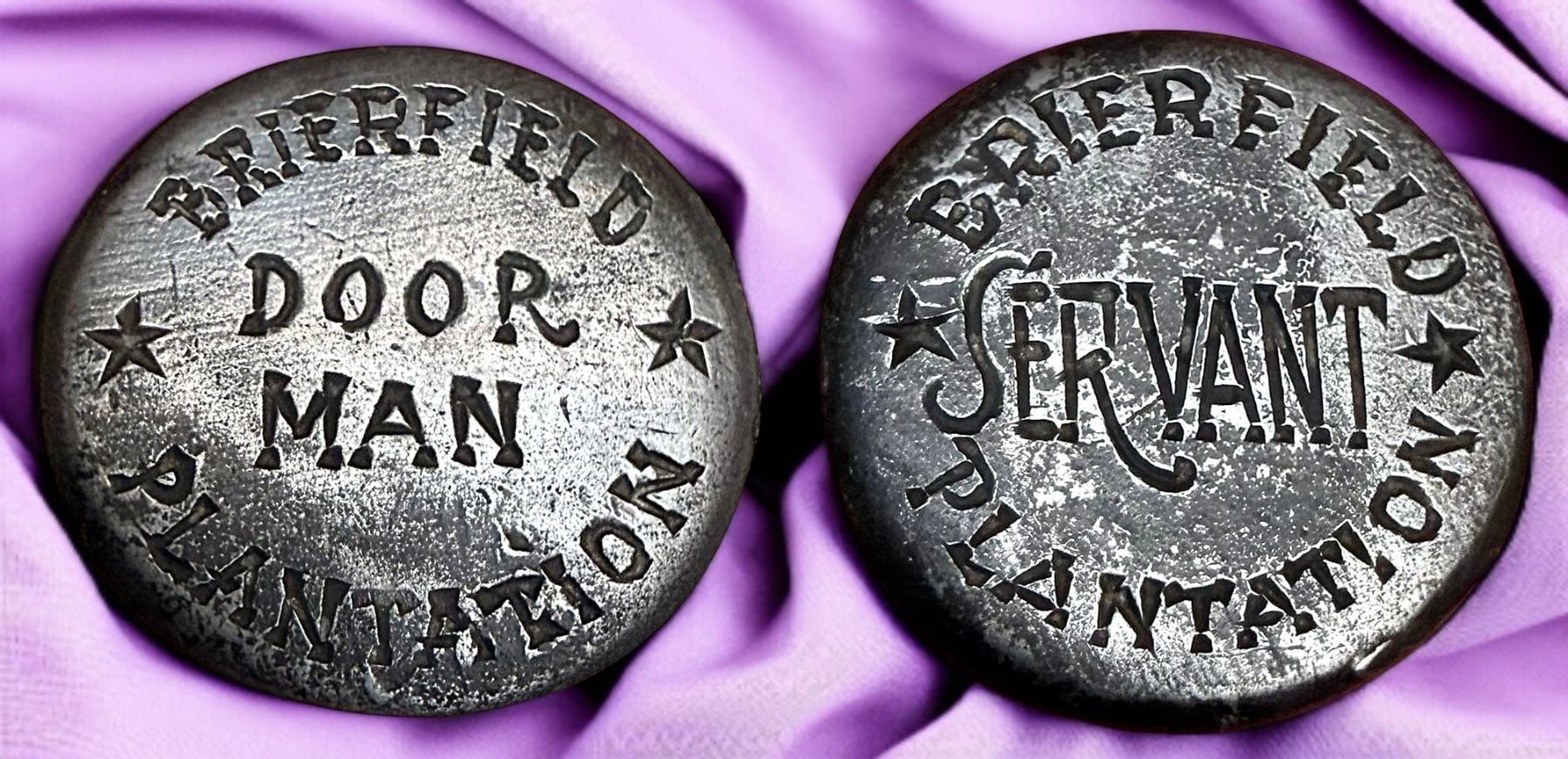 2 Medium size 19th century incredibly RARE Slave buttons. Here are two buttons that do NOT come up for sale and although they represent a part of our history that many want to forget and certainly should put behind them, they are still part of the history of America, no matter how wrong the time of slavery was. These two buttons are from the home of the Famed southerner Jefferson Davis who was President of the Confederate States of America from 1861-1865. These two buttons WERE worn by slaves on his plantation, one is engraved the "SERVANT" and the other, the "DOOR MAN". Davis's plantations name is also engraved on the button BRIERFIELD. These are extremely hard to put a price on as they have not come up before for sale except this pair that Jeff acquired many years ago. These buttons are engraved and dated on the back as well.