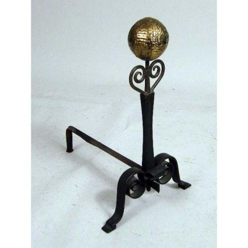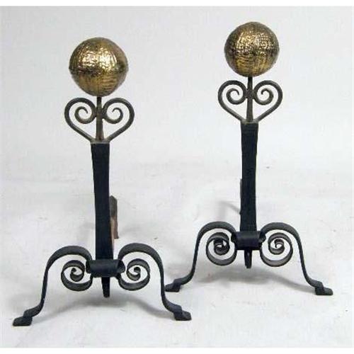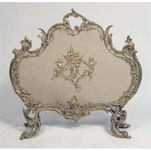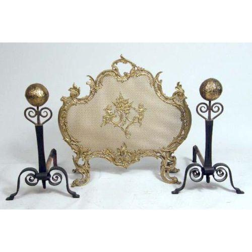 A VICTORIAN BRASS FIRESCREEN<BR><BR>Together with a pair of brass andirons. 3 pieces